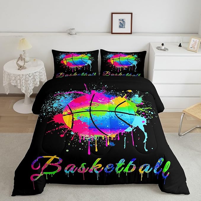 Kids Basketball Comforter Set Full Size Gaming Sports Bedding Set for Boys Girls Teens Bedroom Decor Ball Games Tie Dye Comforter Gift for Basketball Lover Duvet Set with 2 Pillow Case