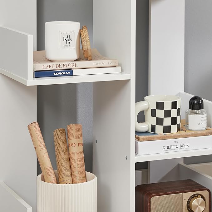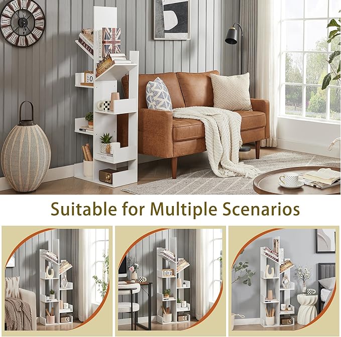 VECELO Tree Bookshelf,8 Shelf Storages Bookcase,Industrial Wooden Book Display Shelves for CDs/Movies/Books,FreeStanding Tree-Shaped Book Case Organizers for Home Office,Living Room,Ivory White
