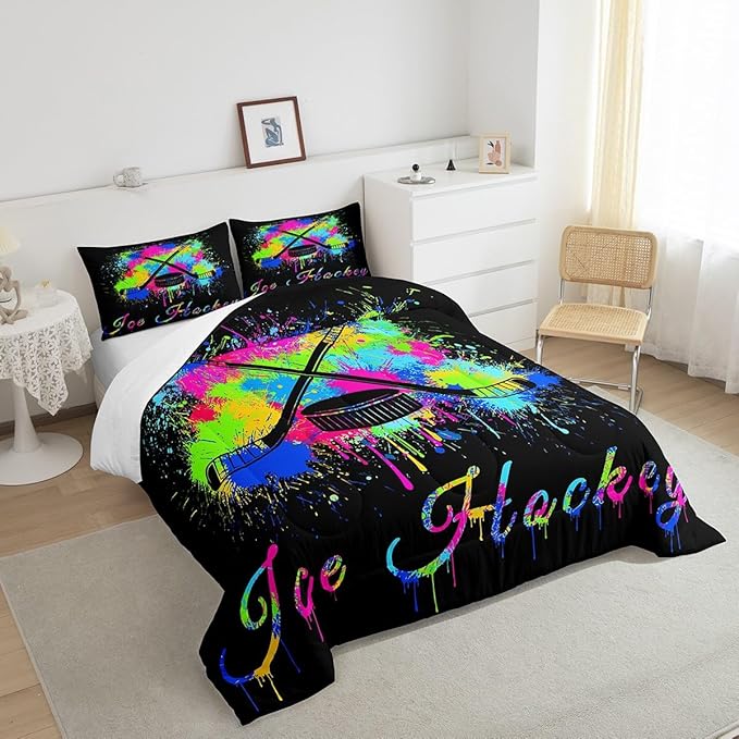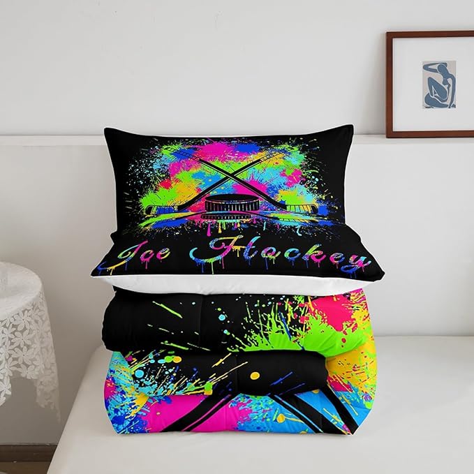 Kids Ice Hockey Comforter Set Full Size Gaming Sports Bedding Set for Boys Girls Teens Bedroom Decor Ice Sports Games Tie Dye Comforter Hockey Player Duvet Set with 2 Pillow Case