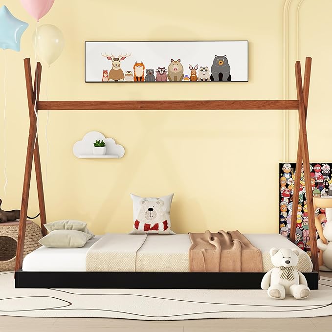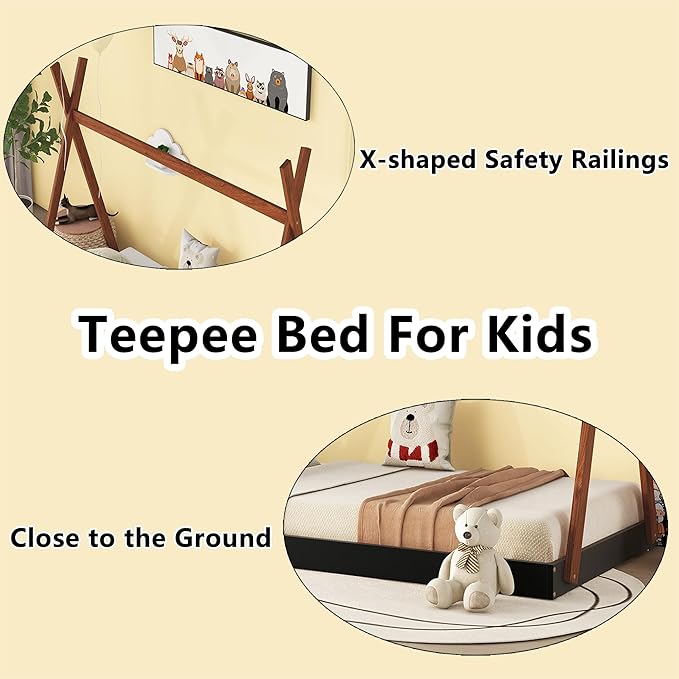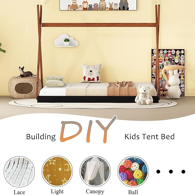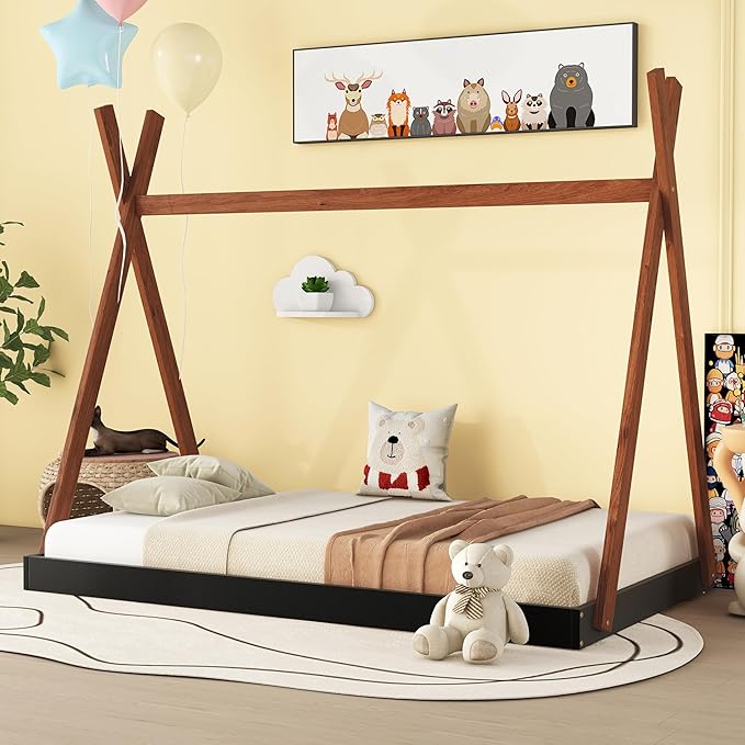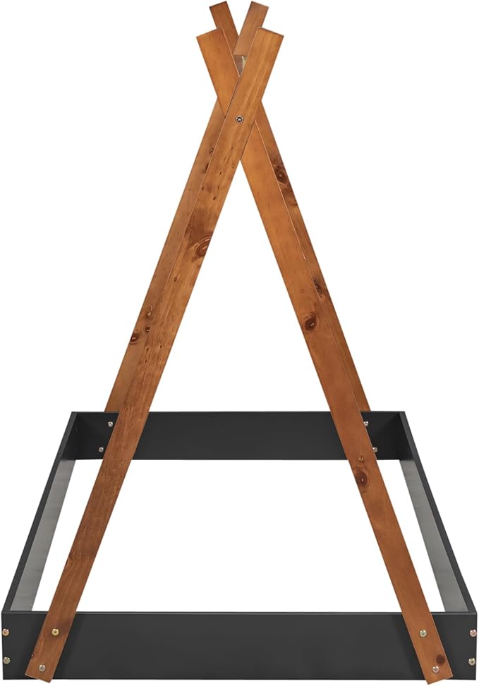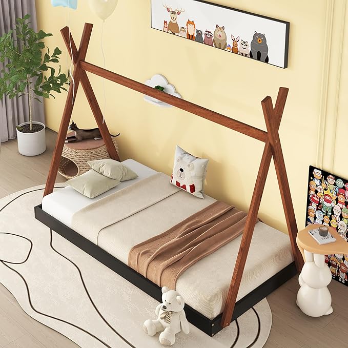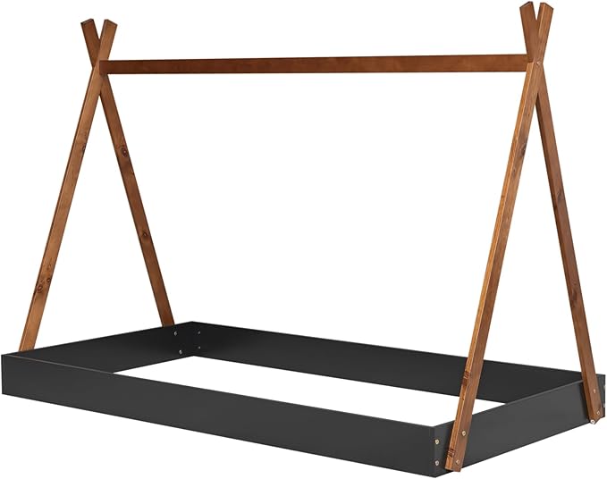 Bellemave Twin Size Tent Floor Bed Frame with Triangle Structure, Teepee Bed Platform Bed for Kids,Montessori Floor Bed for Girls Boys(Twin,Black+Brown)