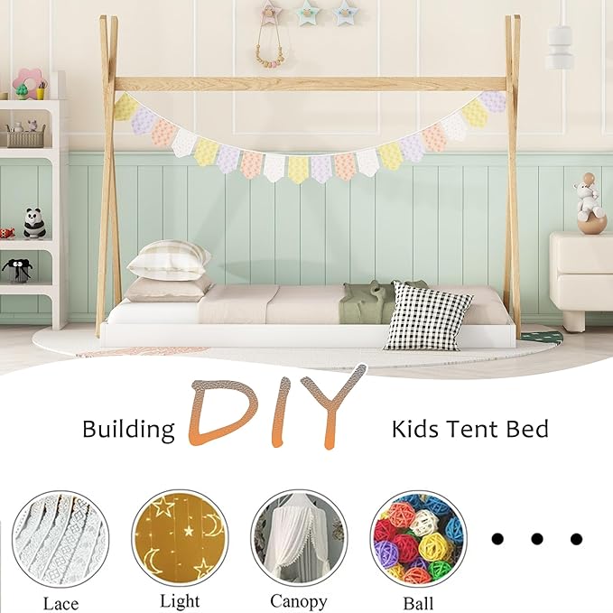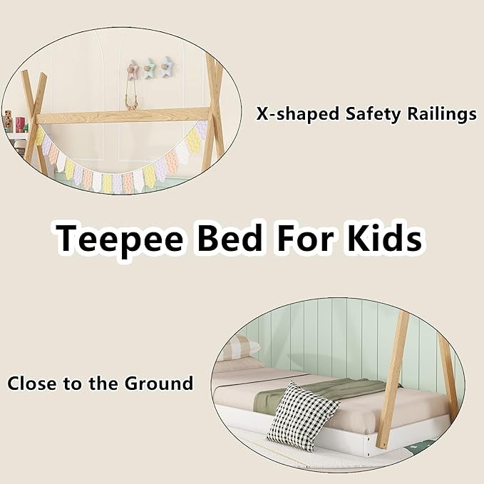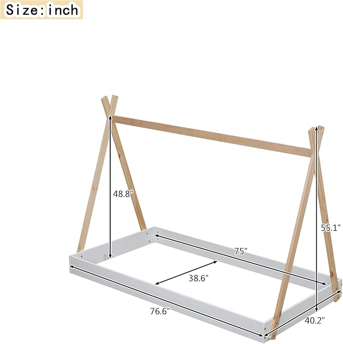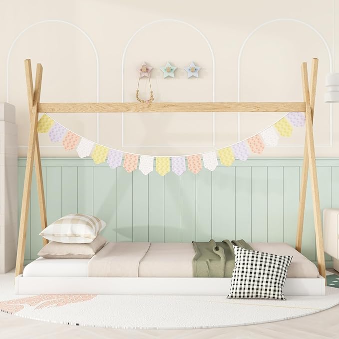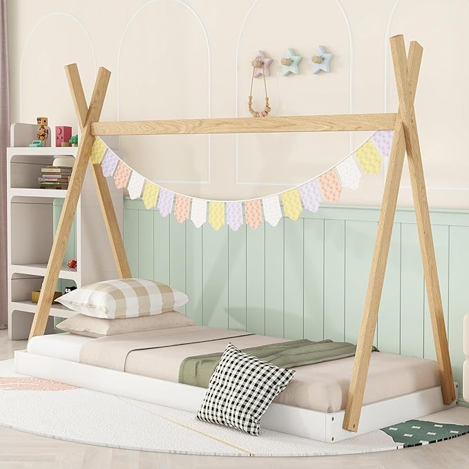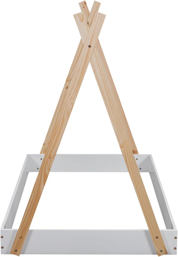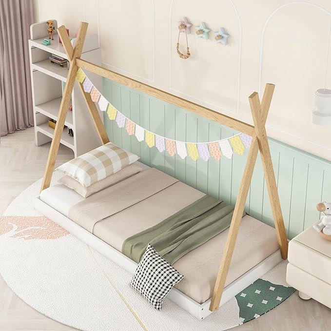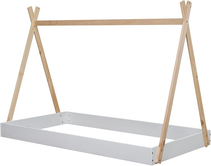 Bellemave Twin Size Tent Floor Bed Frame with Triangle Structure, Teepee Bed Platform Bed for Kids,Montessori Floor Bed for Girls Boys(Twin,White+Natural)