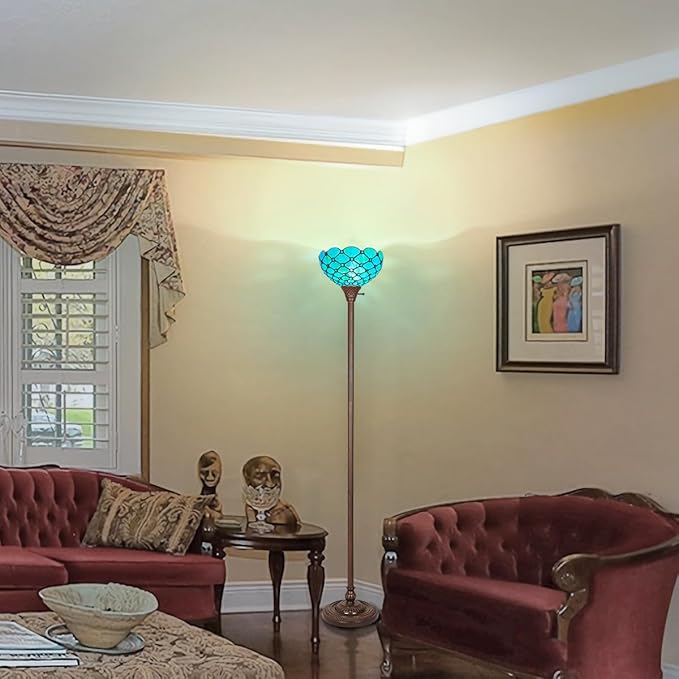 Capulina Tiffany Torchiere Floor Lamp 69 Inches Tall Industrial Pole Seagrass Blue Beads Style Stained Glass Standing Light for Home Office Living Room Bedroom
