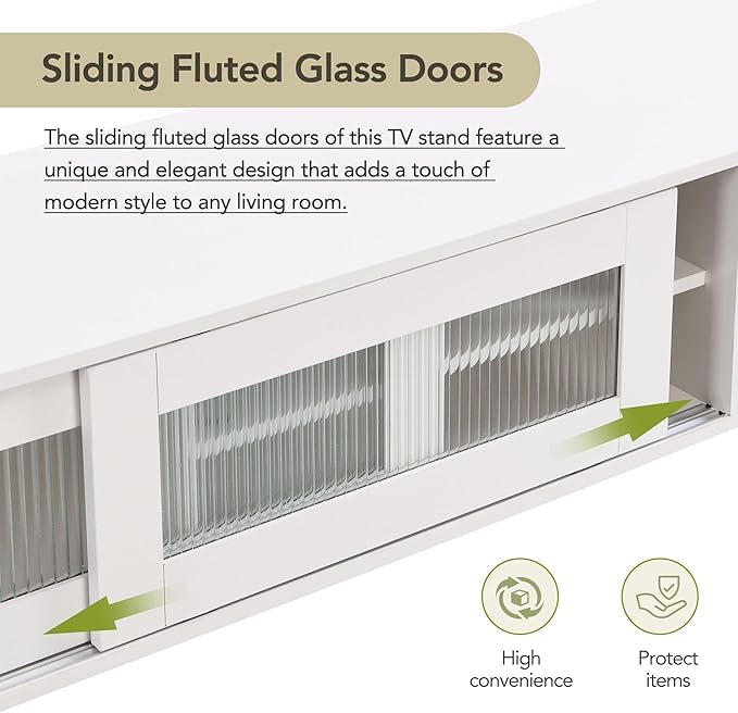TV Stand, 71 Inch Media Console with Sliding Fluted Glass Doors, Slanted Drawers for TVs Up to 75 Inch, Modern Elegant TV Cabinet with Ample Storage Space for Living Room, White
