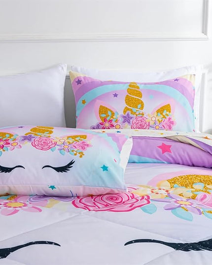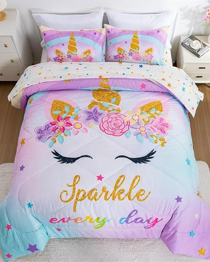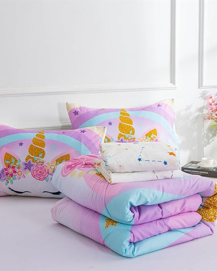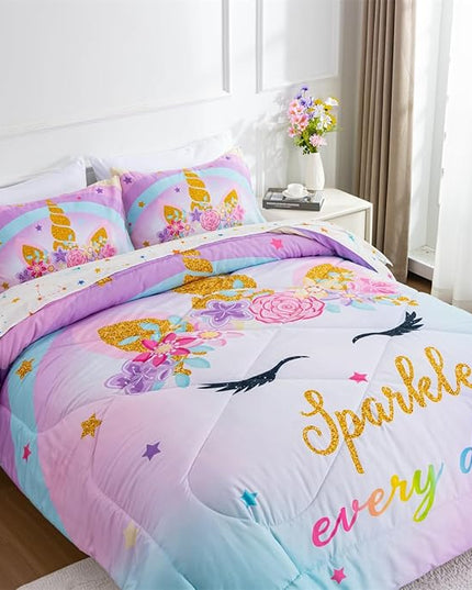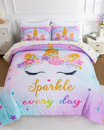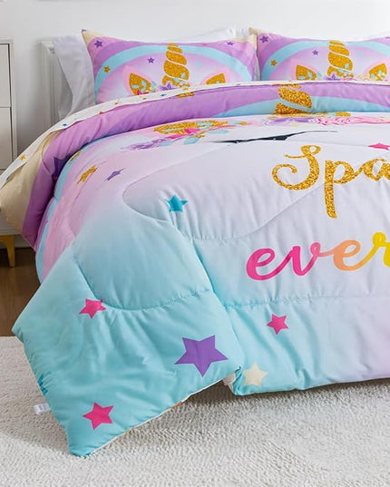NTBED Unicorn Twin Comforter Set with Sheets,5 Pieces Kids Bedding Sets for Girls, Lightweight Microfiber Star Rainbow Bed in a Bag,Blue Purple