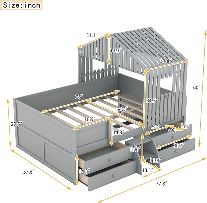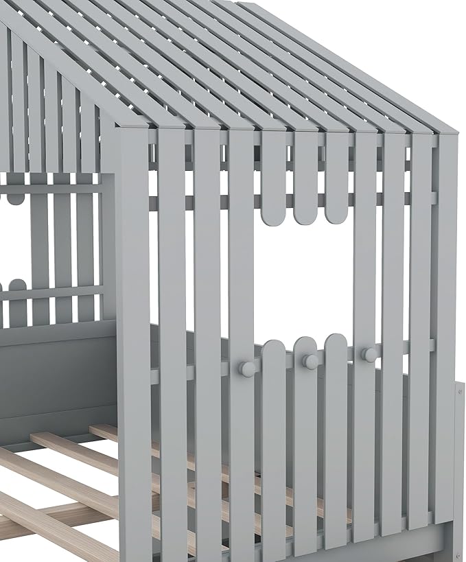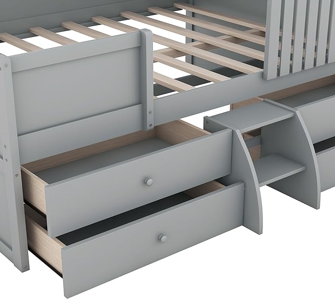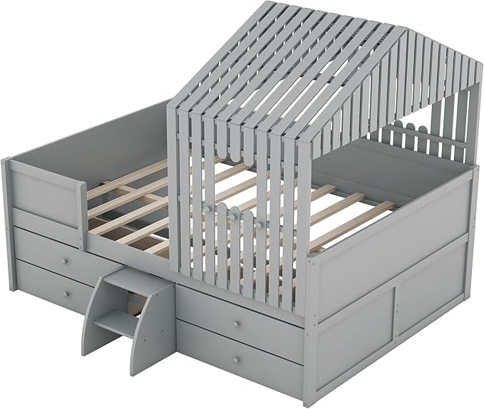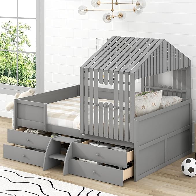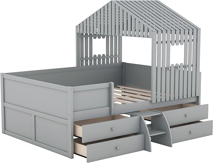 Full Size Low Loft Bed, Wooden House Shaped Loft Bed Frame with 4 Storage Drawers for Kids Teens Boys Girls, Easy Assembly, No Box Spring Needed, Gray
