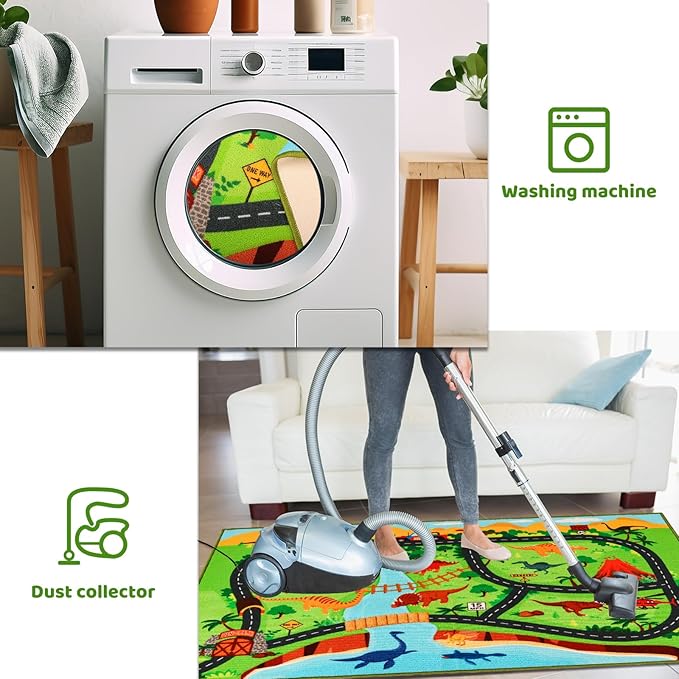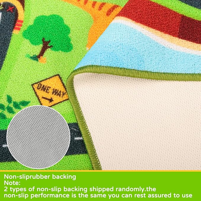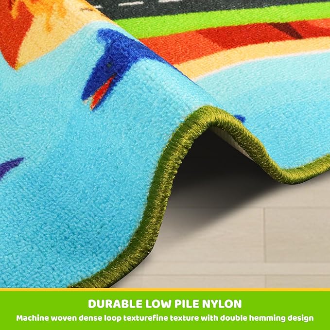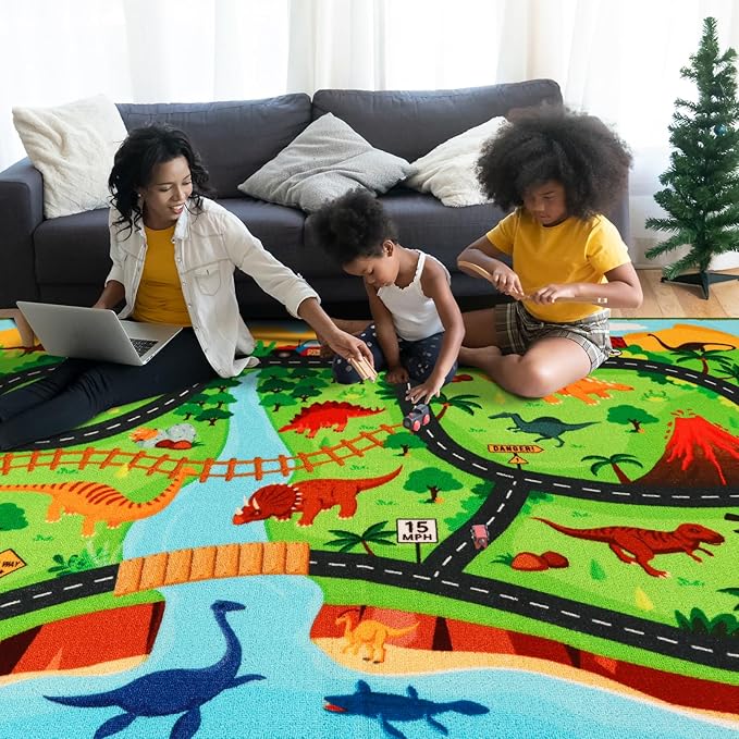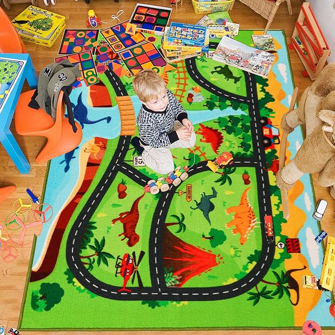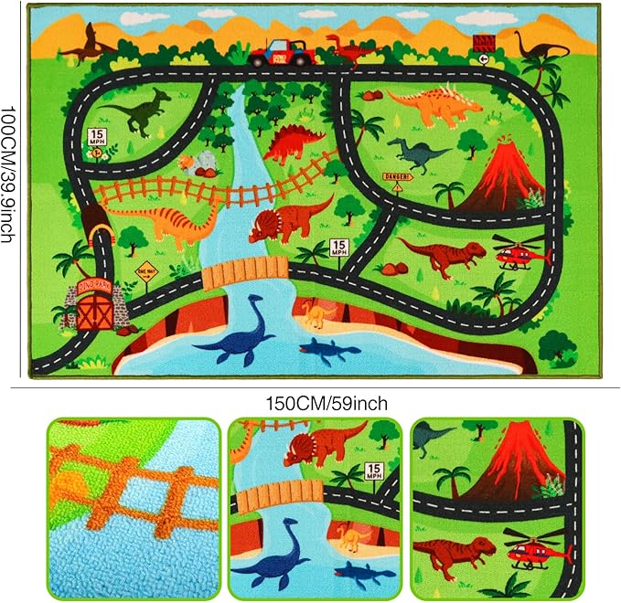 Kids Carpet Playmat Rug,59"X39.4" Dinosaur Car Rugs for Kids Toy Cars,Non Slip Dino Safari Road Map Kids Rug for Playroom Bedroom Boys,Kids Play Mat Road Rug,Track Rug Car Play Carpet for Kids