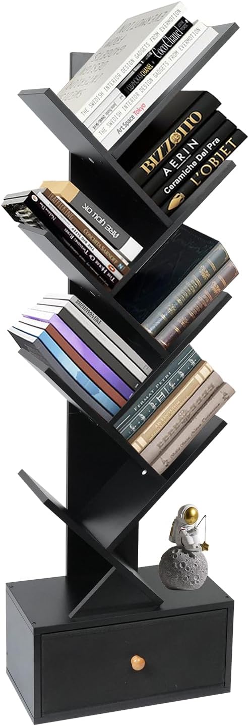 8-Tier Bookshelf Tree Bookshelf Book Tree with Drawer Wooden Bookshelves Storage Rack for CDs/Books, Shelves for Bedroom, Living Room & Office (Black)