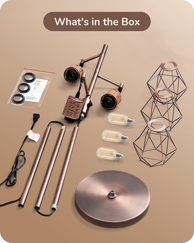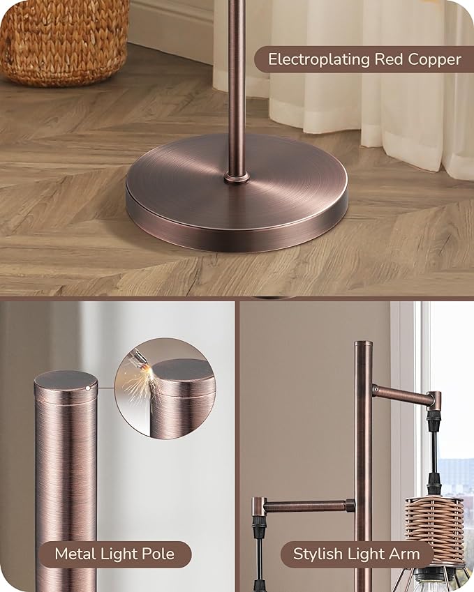 EDISHINE Farmhouse Floor Lamp Dimmable, Industrial Standing Lamp for Living Room, Diamond-Shaped Cage, Corner Rustic Rattan Tall Tree Reading Lamp Home Decor, Electroplated Brushed Red Copper