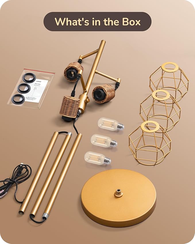 EDISHINE Dimmable Farmhouse Floor Lamp for Living Room, Industrial Standing Lamp with 3 LED Edison Bulbs, Corner Rustic Rattan Tall Tree Reading Lamps Home Decor for Bedroom, Office, Gold