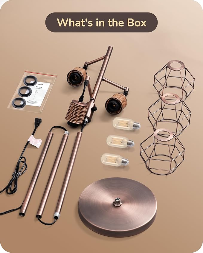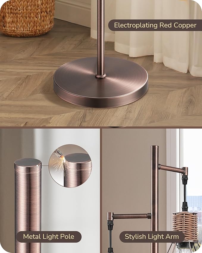 EDISHINE Dimmable Rustic Floor Lamp, Farmhouse Standing Lamp with 3 LED Edison Bulbs, Rattan Design Floor Lamps for Living Room, Bedroom, Reading Corner, Office, Electroplated Brushed Red Copper