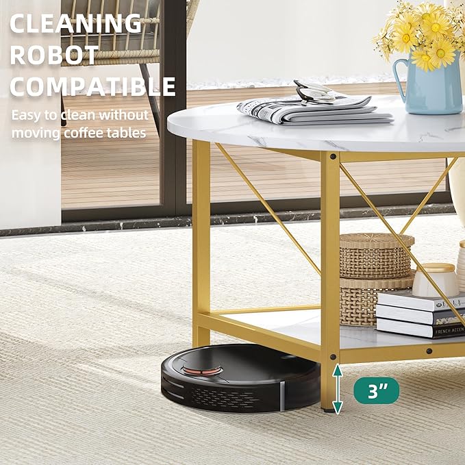 YITAHOME Round Coffee Table,Rustic Wood Coffee Tables for Living Room with Storage Shelf, Modern Farmhouse Circle Coffee Table Center with Sturdy Metal Legs Home Furniture, Gold and White