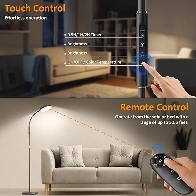 LED Floor Lamp, Height Adjustable Floor Lamps for Living Room, Super Bright Standing Lamp with Timer, Adjustable Colors & Brightness Floor lamp for Bedroom with Remote & Touch Control, Black