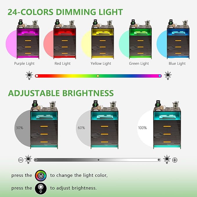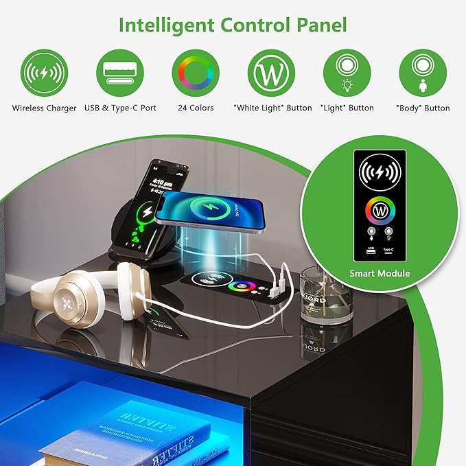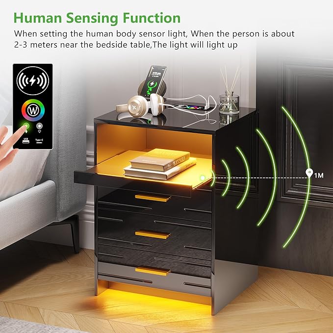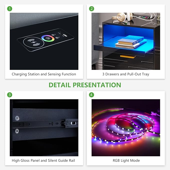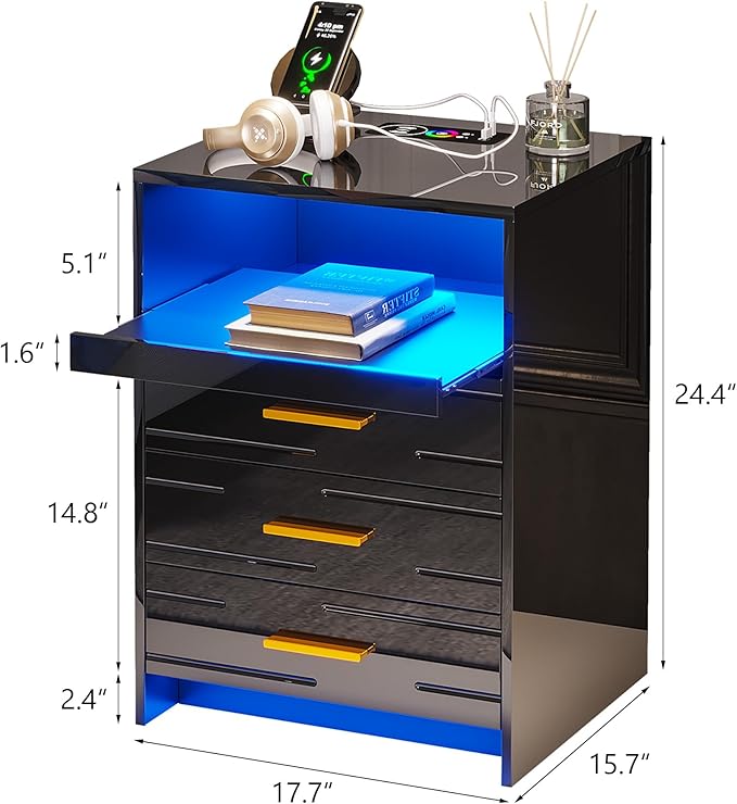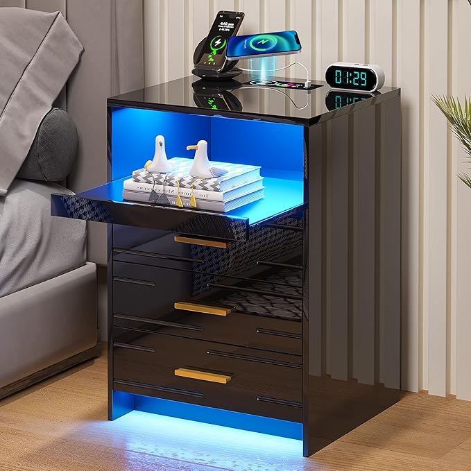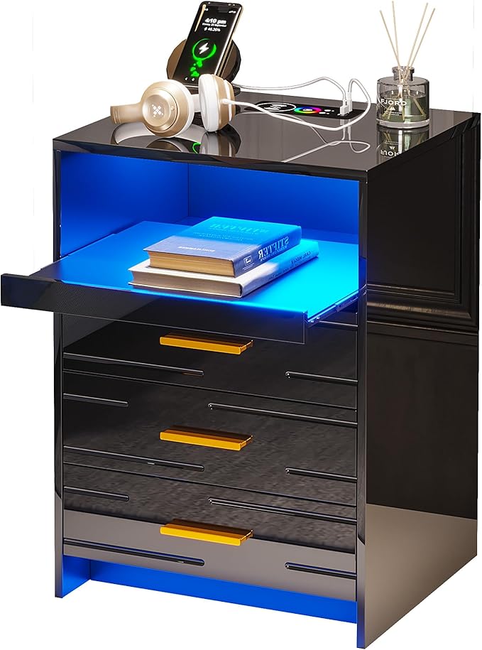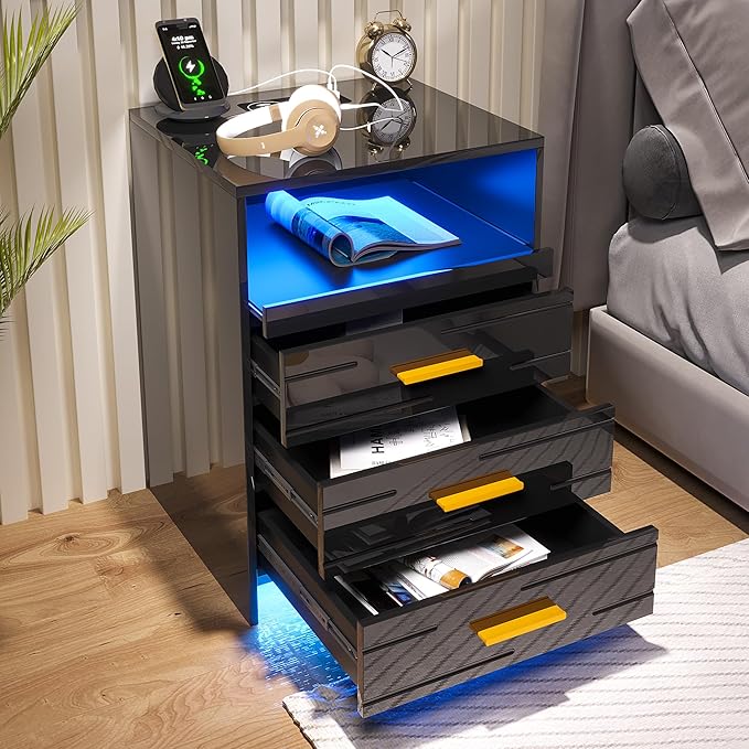 HNEBC RGB LED Nightstand with Wireless Charging Station, Smart Night Stand with 3 Drawers and Sliding Tray, Modern Bedside Table for Bedroom Furniture, High Gloss End Sofa Tables (B Black)