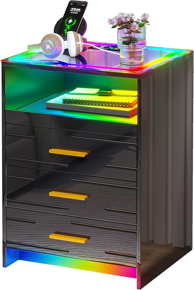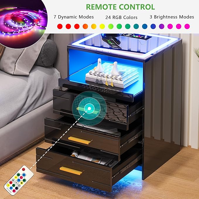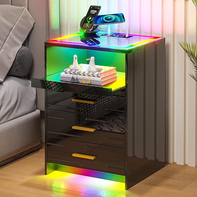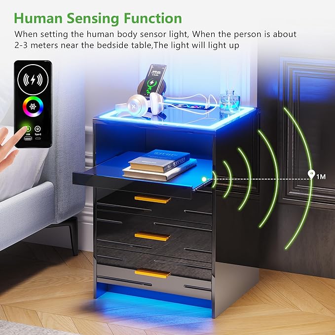 HNEBC High Gloss Nightstand with Wireless Charging Station, Smart Night Stand with RGB Dynamic Lighting, Modern Bed Side Table with Drawers Sliding Tray, Glass Tabletop,Motion Sensor Lights (C Black)