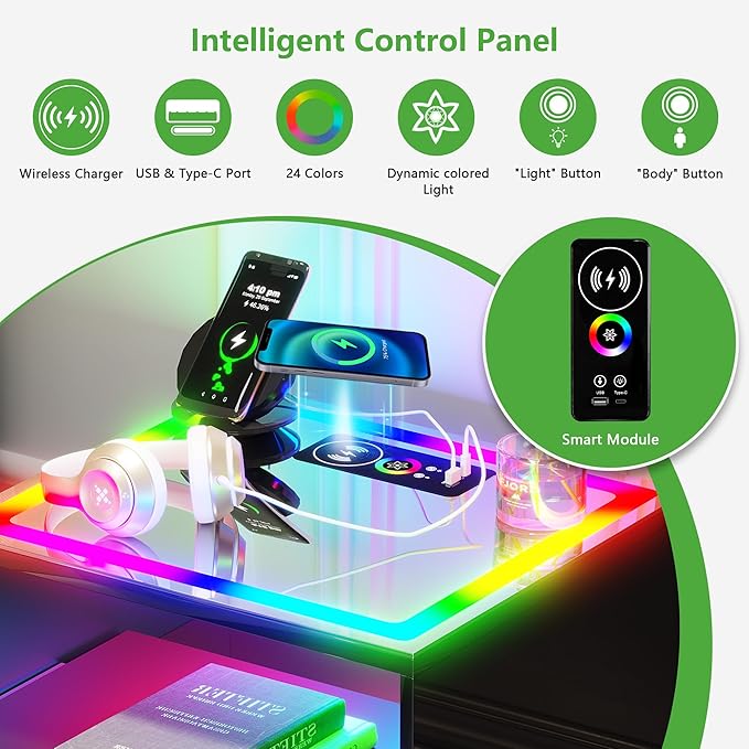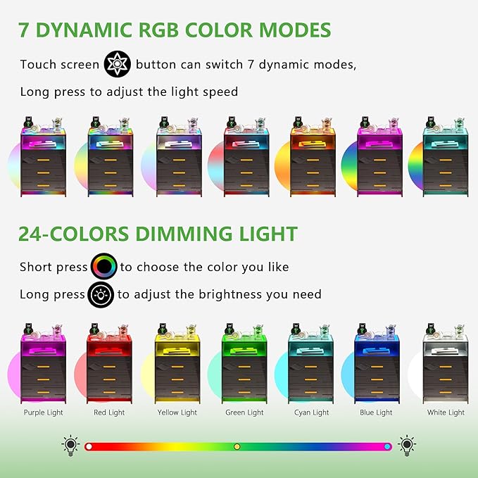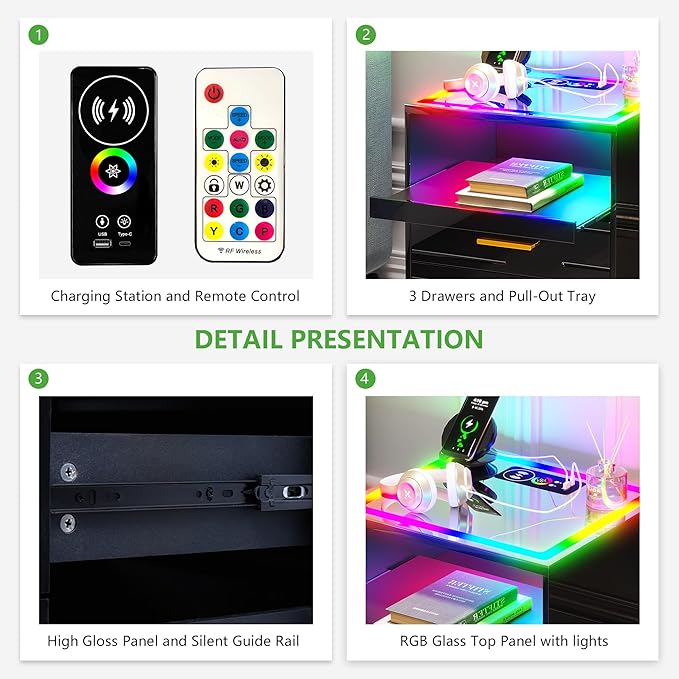 About This ✅【RGB Glass Top Panel with lights】The nightstand has RGB 7 dynamic lighting modes and Auto sensor light, with...