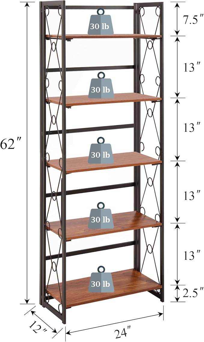 VECELO Folding Bookshelf,5 Tier Bookcase Foldable Easy Assembly, Industrial Book Shelf Storage Organizer with X Metal Frame and Anti-Toppling Design,1 Set