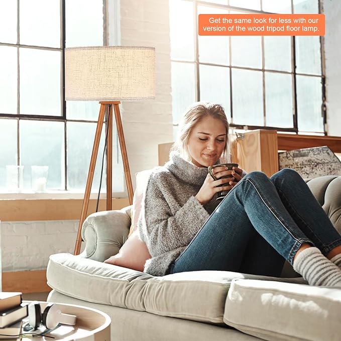 Wood Tripod Floor Lamp with Shelves,Linen Shade Boho Wooden Floor lamp for Living Room, with Three Color temparature Bulb Included,footswitch,ETL Listed/Brown Wood Color