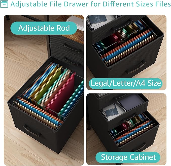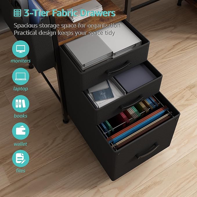Lufeiya Computer Desk with Fabric File Drawers Cabinet, 55 Inch Home Office Desk with Shelves Monitor Stand, Study Writing Gaming Desks with Led Light Power Outlets for Bedroom, Rustic Brown