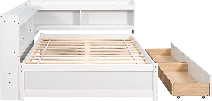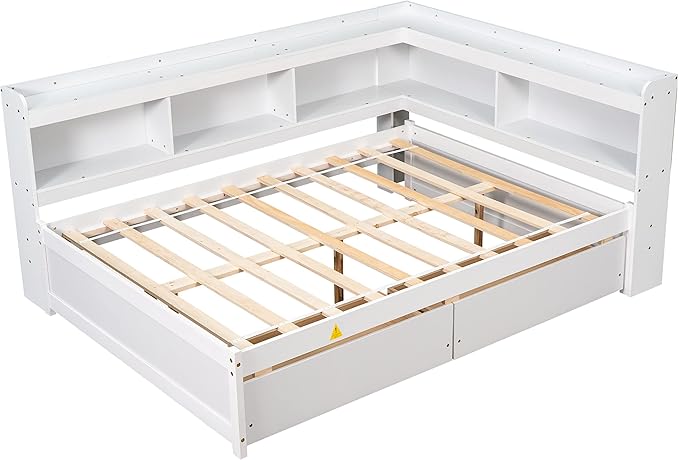 Full Size Wooden Daybed with L-Shaped Bookcases and 2 Storage Drawers, Modern Day Sofa Bed Frame with Headboard for Living Room, Bedroom, Guestroom, Easy Assembly, White
