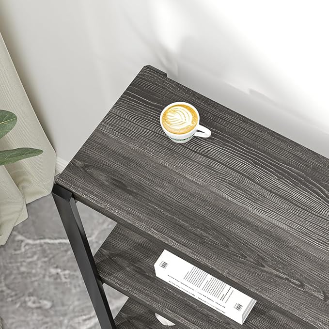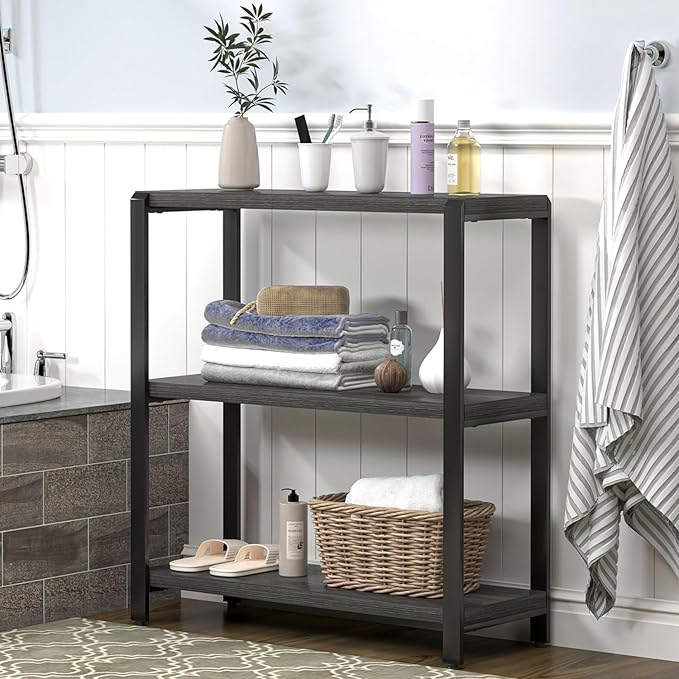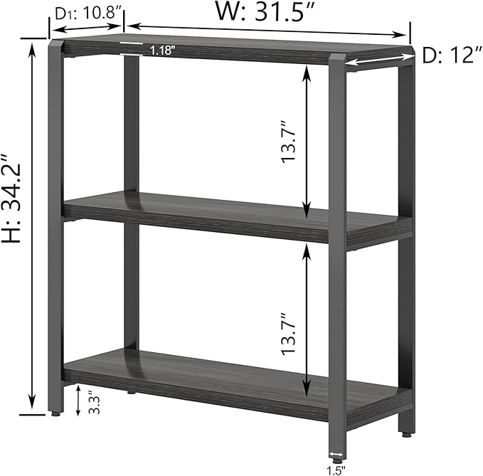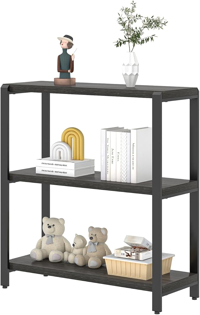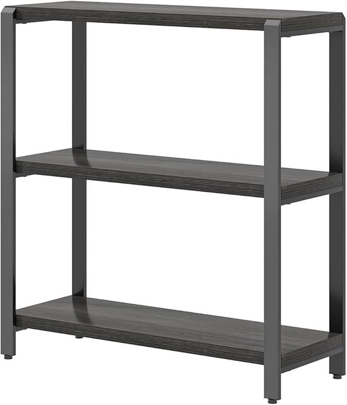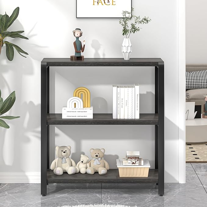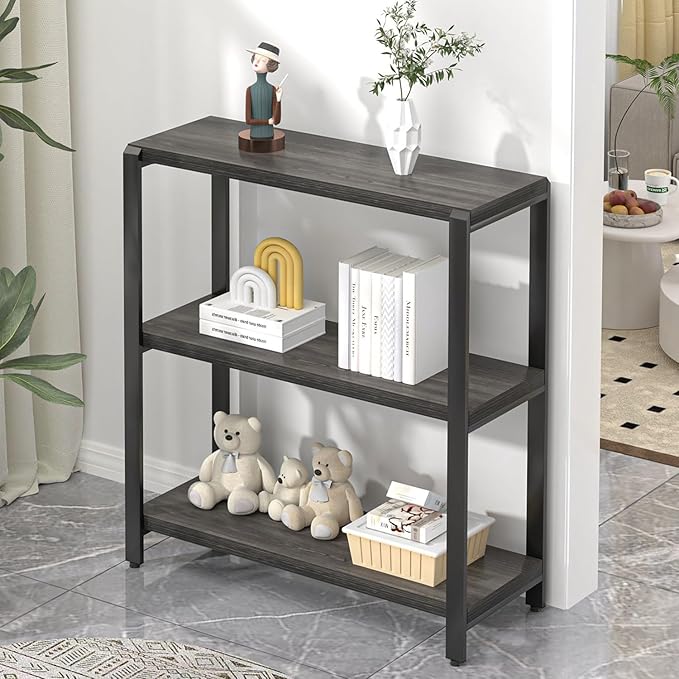 FOLUBAN Rustic Small Bookshelf and Bookcase, 3 Tier Low Short Book Shelf, Industrial Metal and Wood Book Case for Bedroom Living Room, Dark Gray