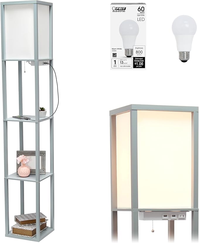 Simple Designs LF1037-GRY-LB Three Shelf Etagere Organizer Storage Floor Lamp with 2 Dual USB Ports and Charging Outlet, Gray, with Feit LED Bulb Included