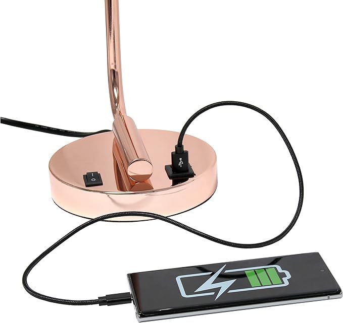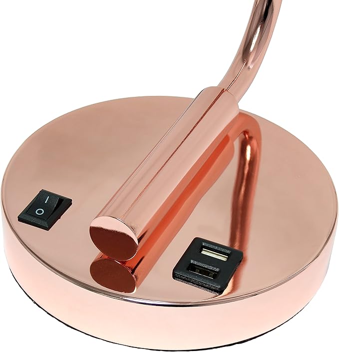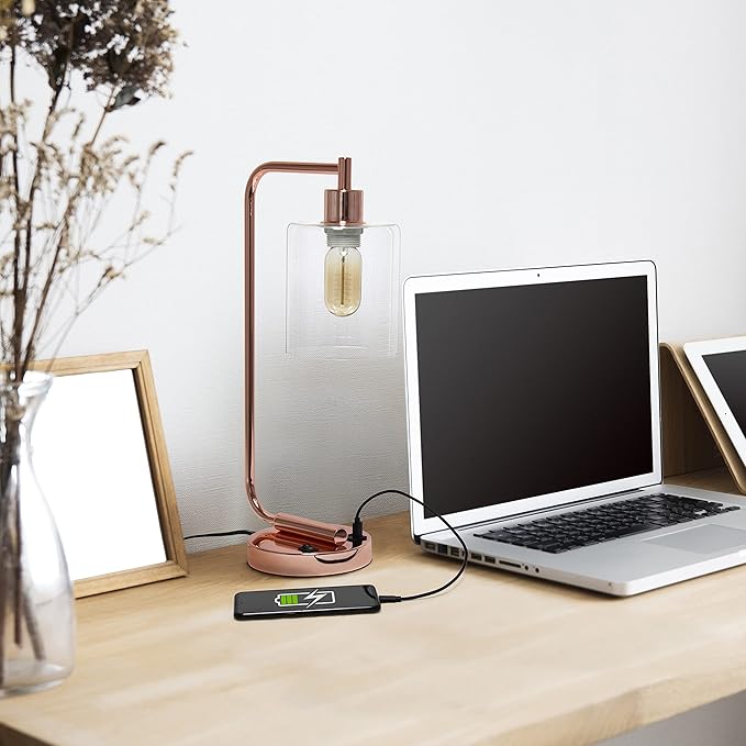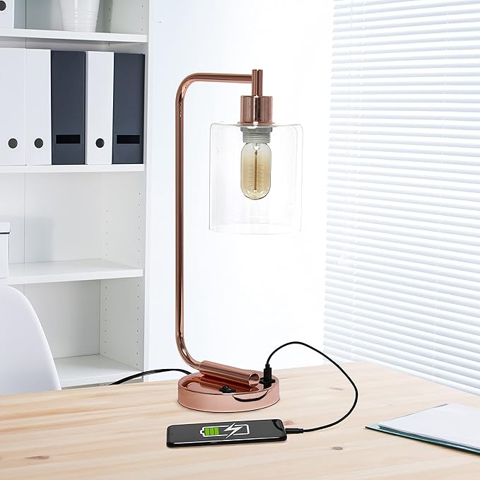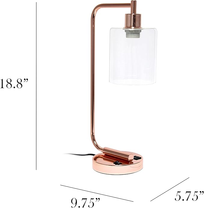 Simple Designs LD1066-RGD-LB Industrial Vintage Bronson Iron Lantern Desk Table Lamp with USB Port and Glass Cylinder Shade for Office, Living Room, Bedroom, Rose Gold, with Feit LED Bulb Included