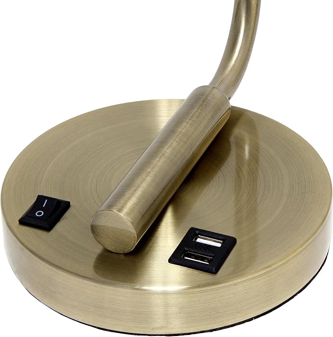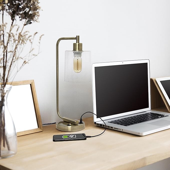 Simple Designs LD1066-ABS-LB Industrial Vintage Bronson Iron Lantern Desk Table Lamp with USB Port and Glass Cylinder Shade for Office, Living Room, Bedroom, Antique Brass, With Feit LED Bulb Included