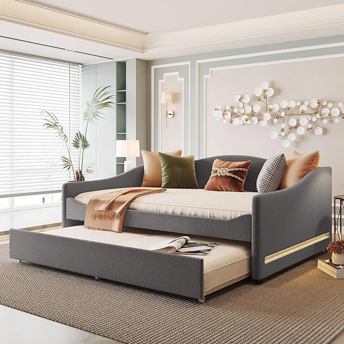 Teddy Fleece Full Size Upholstered Daybed with LED Light and Trundle,Modern Wood Platform Bed W/Side Stripes,Easy Assembly,for Bedroom,Living Room,Guestroom,Gray