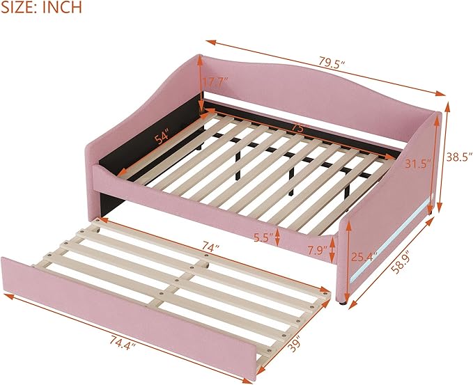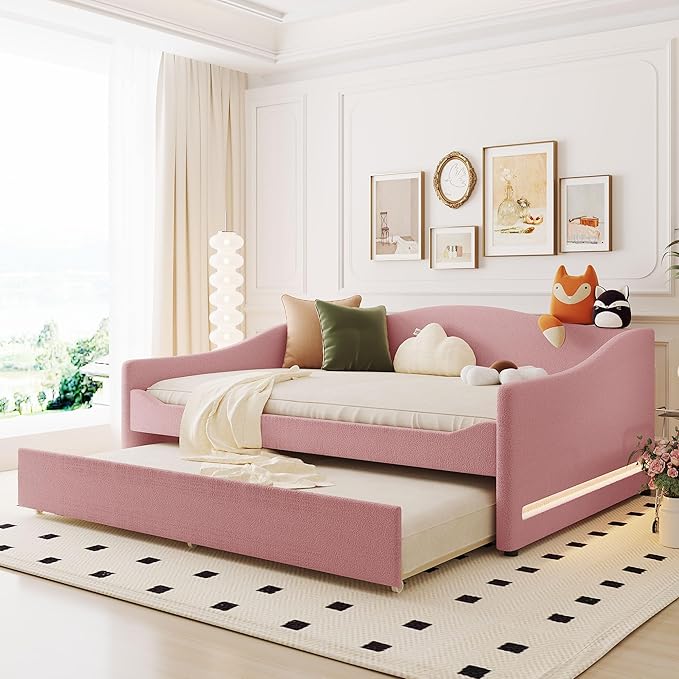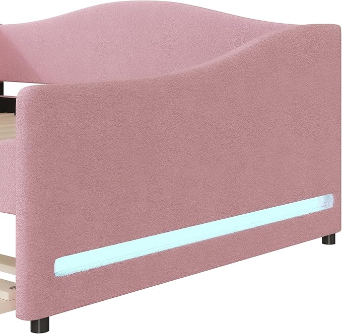 Teddy Fleece Full Size Upholstered Daybed with LED Light and Trundle,Modern Wood Platform Bed W/Side Stripes,Easy Assembly,for Bedroom,Living Room,Guestroom,Pink