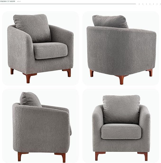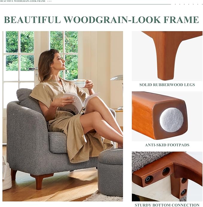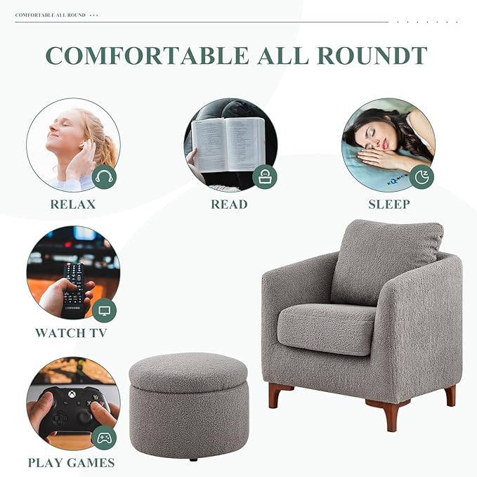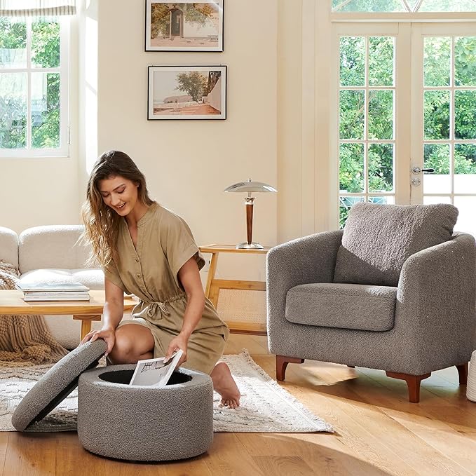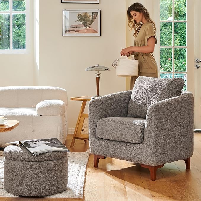 COLAMY Sherpa Accent Chairs with Storage Ottoman Set of 2, Upholstered Barrel Arm Chair with Footrest, Modern Living Room Chair with Back Pillow, Grey