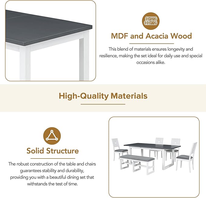 Modern Extendable Set for 6-White Expandable Dining Room Table with 18" Butterfly Leaf, 4 Upholstered Chairs, and Bench