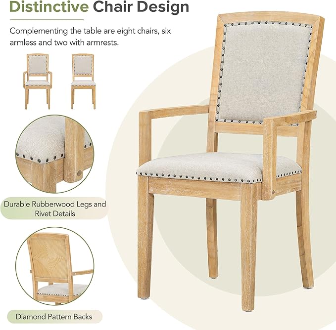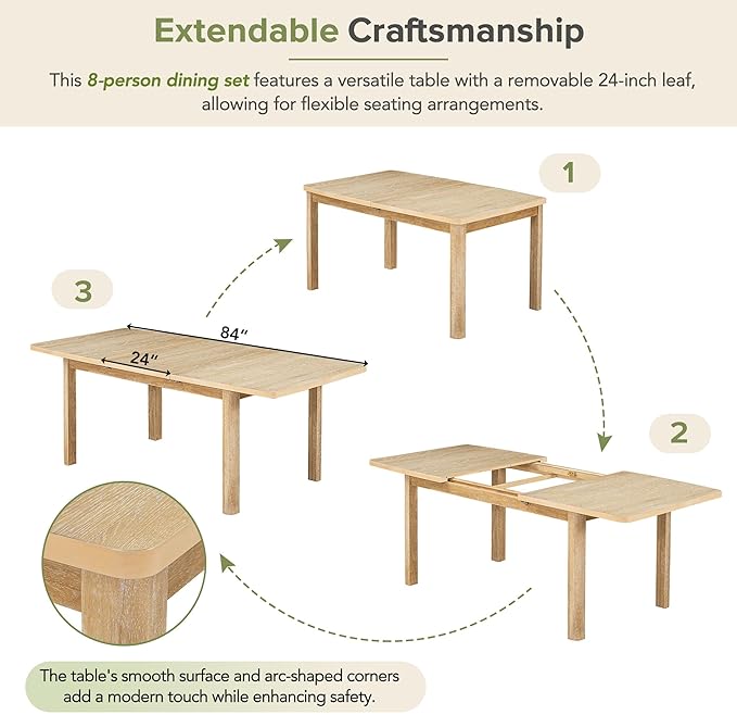 Rustic 9-Piece Wood Dining Set for 8 People, 84" Extendable Rectangular Kitchen Table with Removable Leaf and 8 Upholstered Chairs, Natural, 1