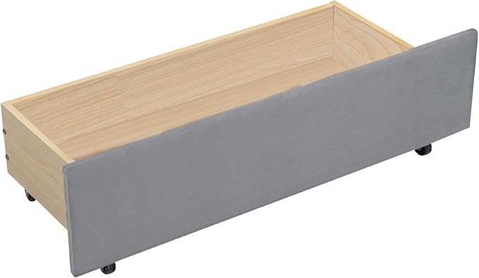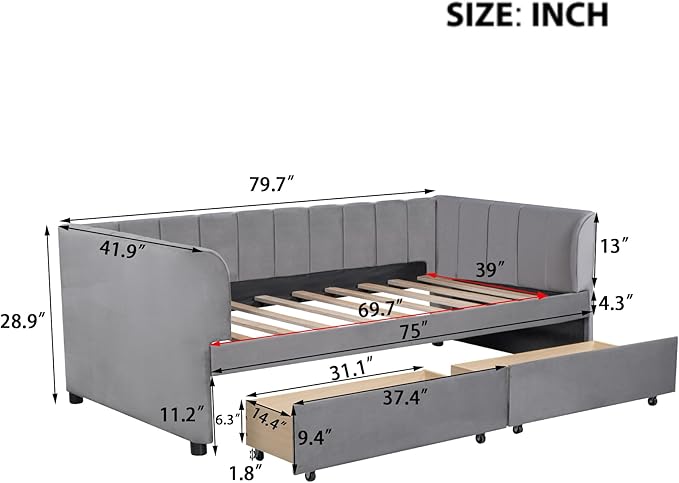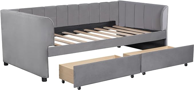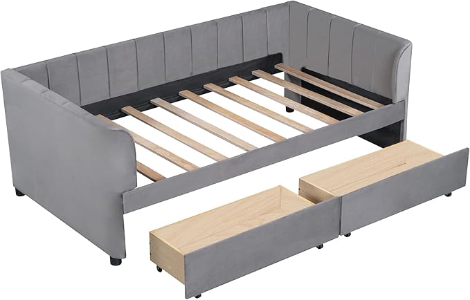 Twin Size Velvet Daybed with Two Drawers and Stripe Shaped Headboard Design,Upholstered Wooden Storage Bed Frame,w/Ergonomic Backrest,for Bedroom,Living Room,Gray