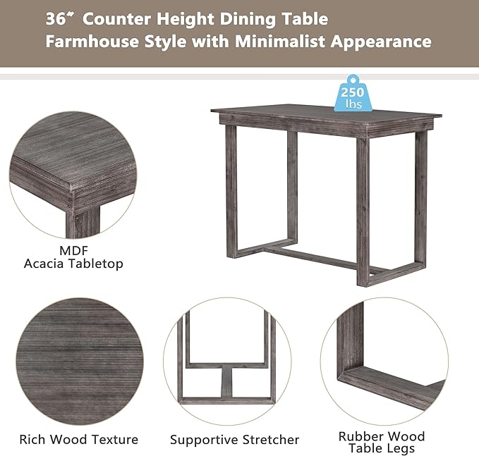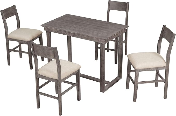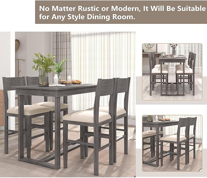 Farmhouse 5-Piece Counter Height Dining Set with Rectangular Kitchen Table and 4 Upholstered Chairs for Small Places, Apartment, Living Room, Gray
