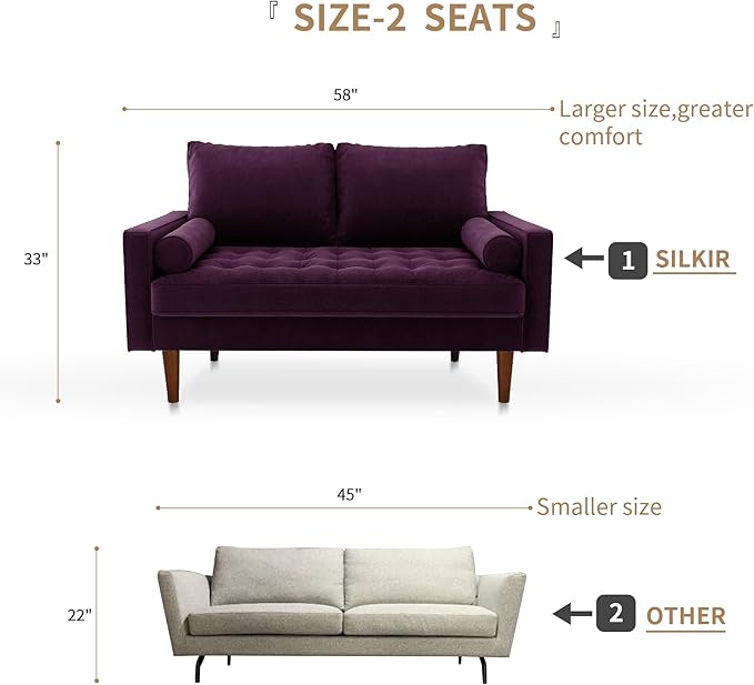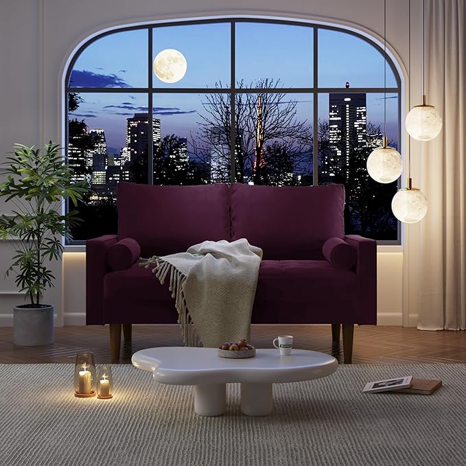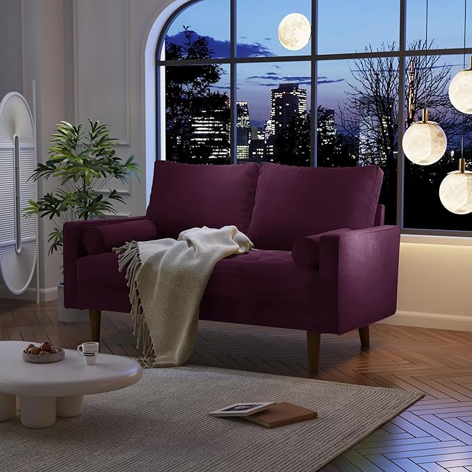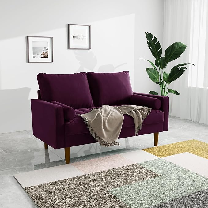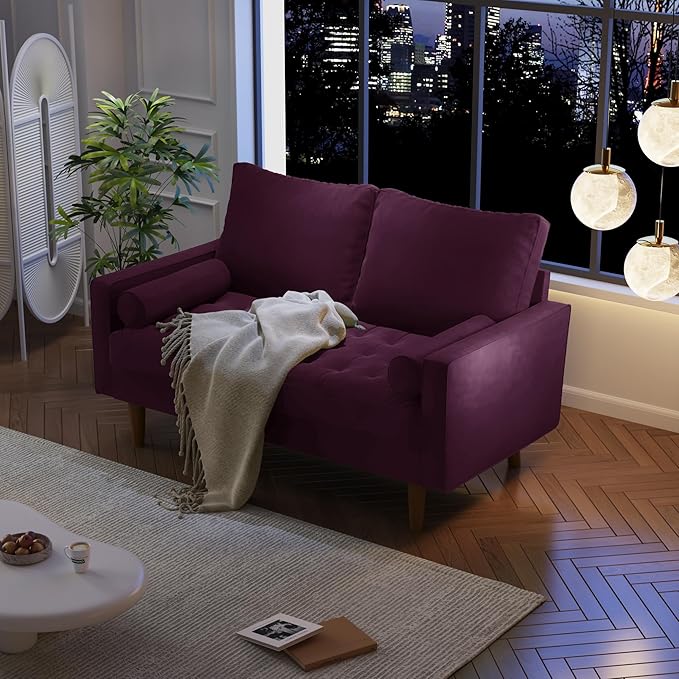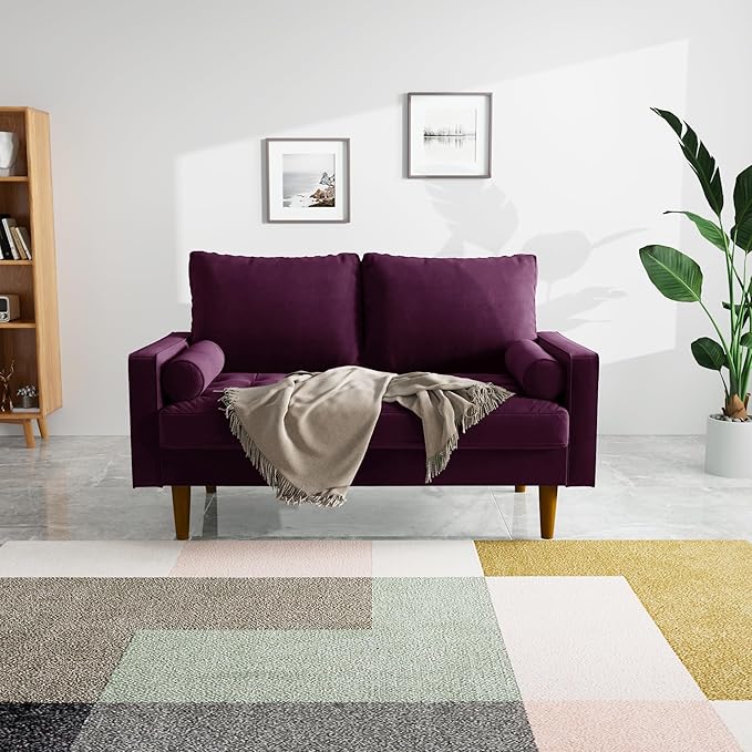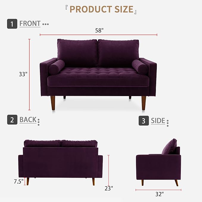 Velvet Furniture for Small Spaces, Mid-Century Modern Loveseats for Living Room, Love Seat Couch Sofas, 58 Inches, Eggplant