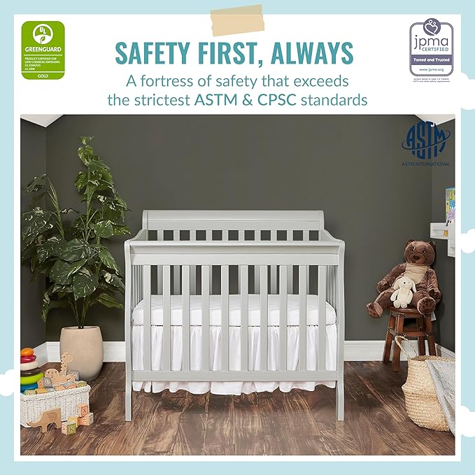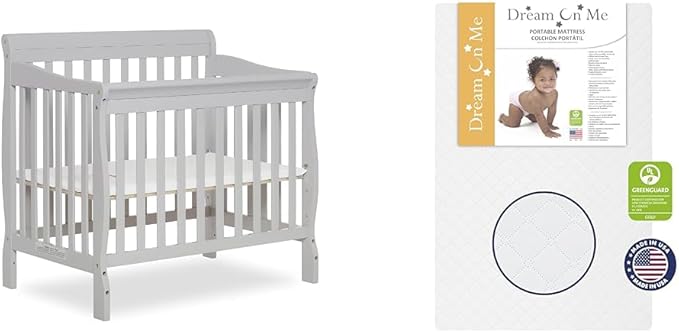 Aden 4-in-1 Convertible Mini Crib in Grey, Greenguard Gold Certified & Sunset 3” Extra Firm Fiber Crib Mattress, Greenguard Gold Certified, Waterproof Vinyl Cover, Baby Mattresses