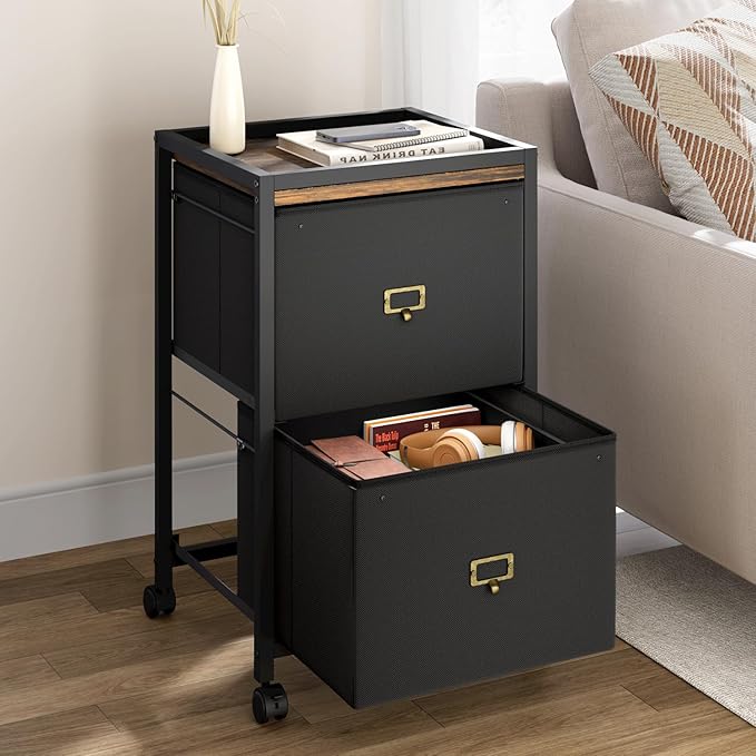 File Cabinet with 2 Drawers, Mobile Filing Cabinet Fits Letter Size or A4, Fabric Vertical File Cabinet on Wheels, File Cabinet for Home Office, Small Under Desk Storage Cabinet, Black