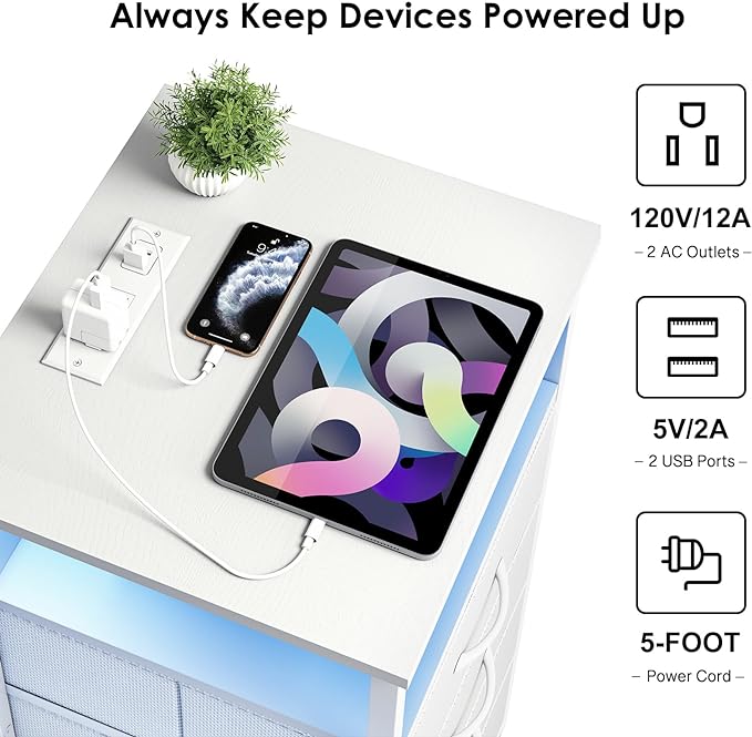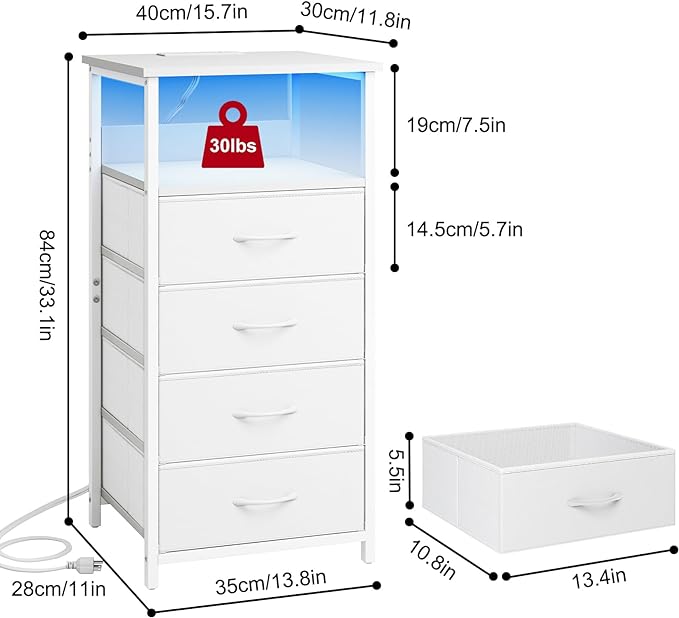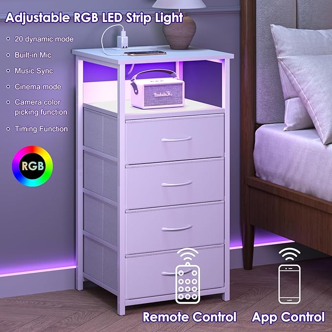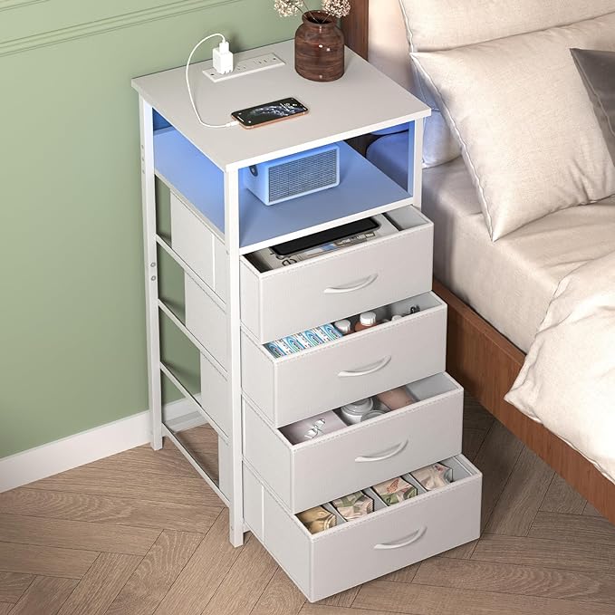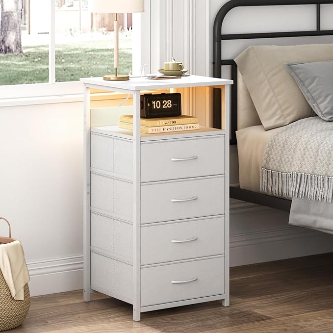 Fixwal Dresser for Bedroom, LED Tall Nightstand with Charging Station Night Stand with USB Ports and Outlets, 4 Fabric Storage Drawers with PU Finish, Bed Side Table, White