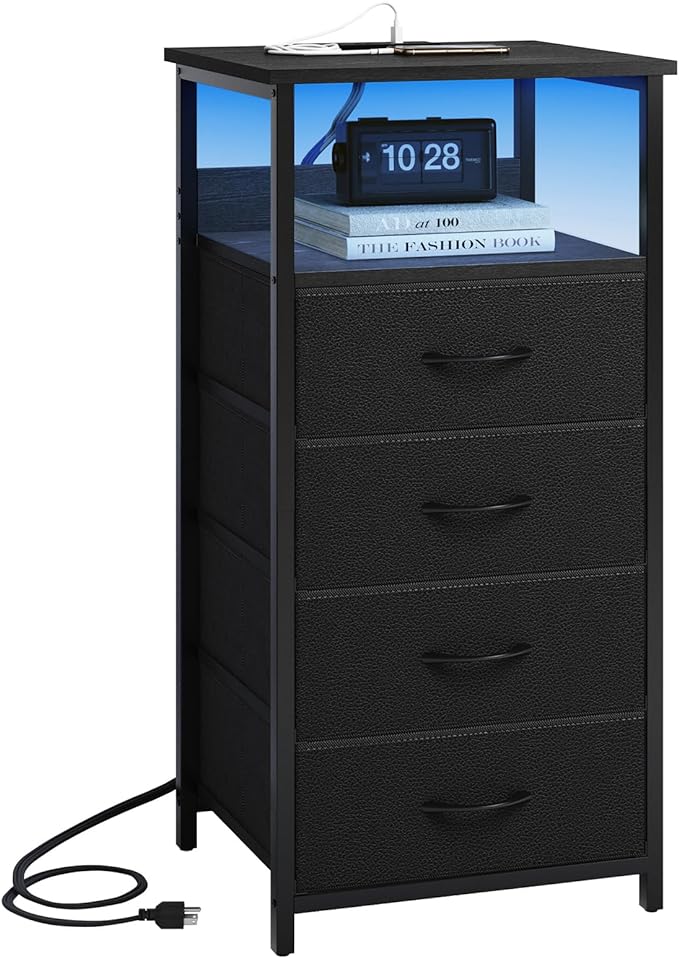 Fixwal Night Stand with Charging Station, LED Dresser for Bedroom Tall Nightstand with USB Ports and Outlets, 4 Fabric Storage Drawers with PU Finish, Bed Side Table, Black