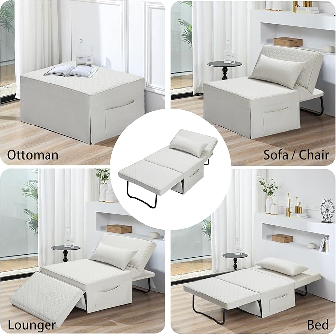 Sofa Bed, 4 in 1 Multi-Function Folding Ottoman Breathable Linen Couch Bed with Adjustable Backrest Modern Convertible Chair for Living Room Apartment Office,Squared-Linen White