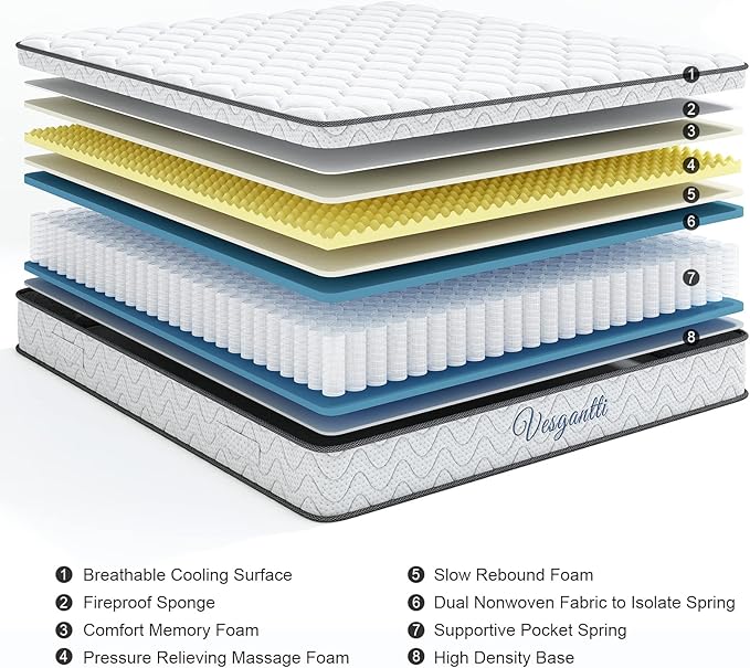 Vesgantti Full Size Mattress, 10.1 Inch Hybrid Full Mattress in a Box, Double Mattress with Memory Foam and Pocket Spring, Ergonomic Design & Pressure Relief, Medium Firm Feel