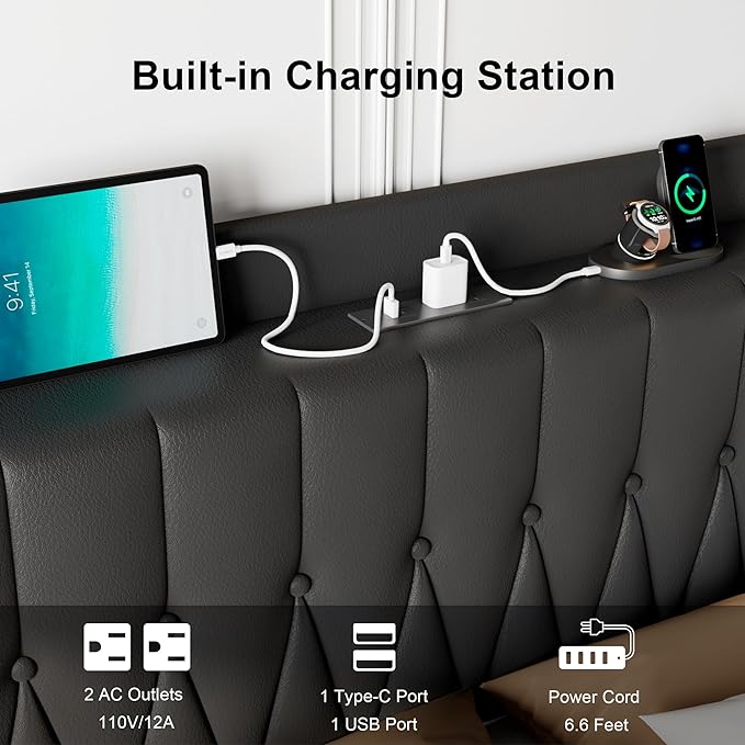About This Charging Easily: Headboard built-in 2 AC Outlets and type C and USB port, making it easy to charge...