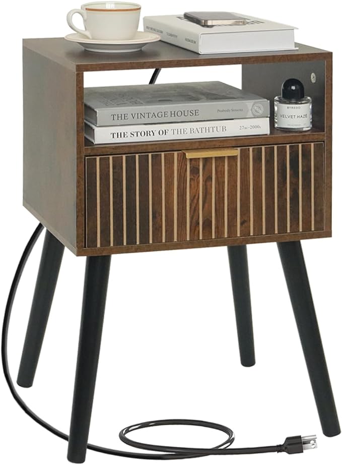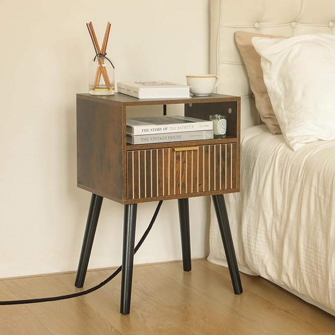 Mid Century Modern Nightstand with Charging Station, Wood Bedside Table with Drawer, Modern End Table for Bedroom and Small Spaces, Easy Assembly, Rustic Brown and Black