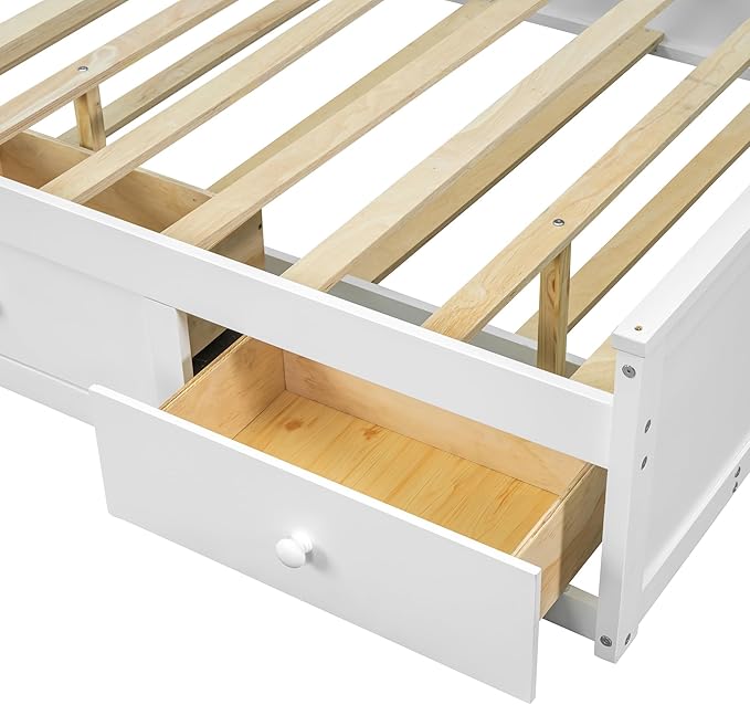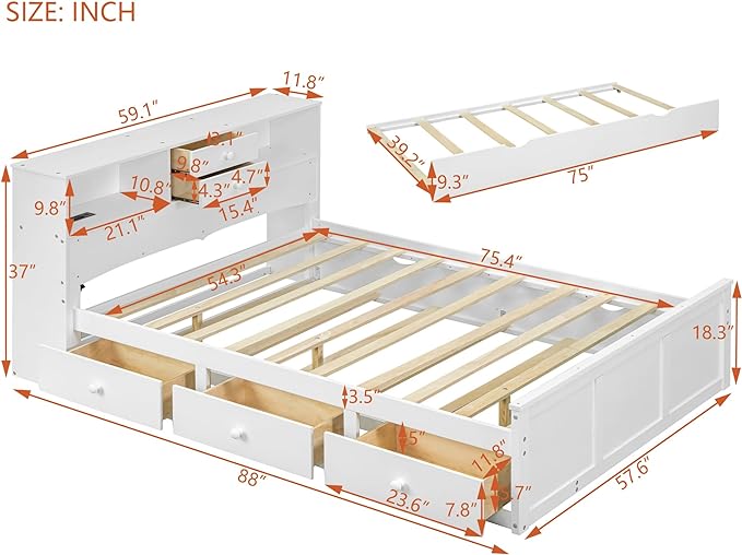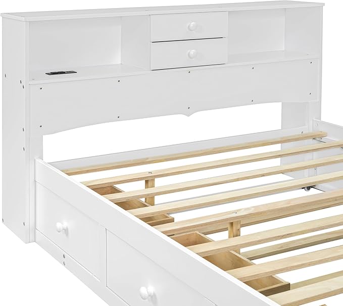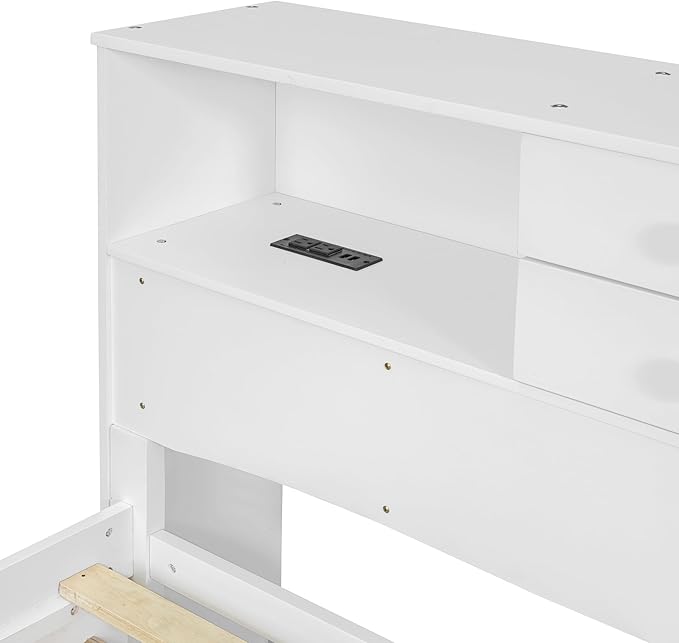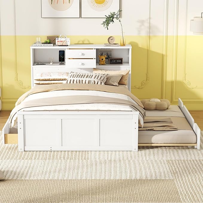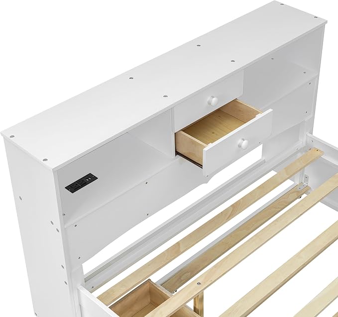 Full Size Wood Pltaform Trundle and 3 Drawers/Upper Shelves,Multifunctional Storage Bed Frame,W/a Set of USB Ports & Sockets,for Apartment,Bedroom,Living Room,White