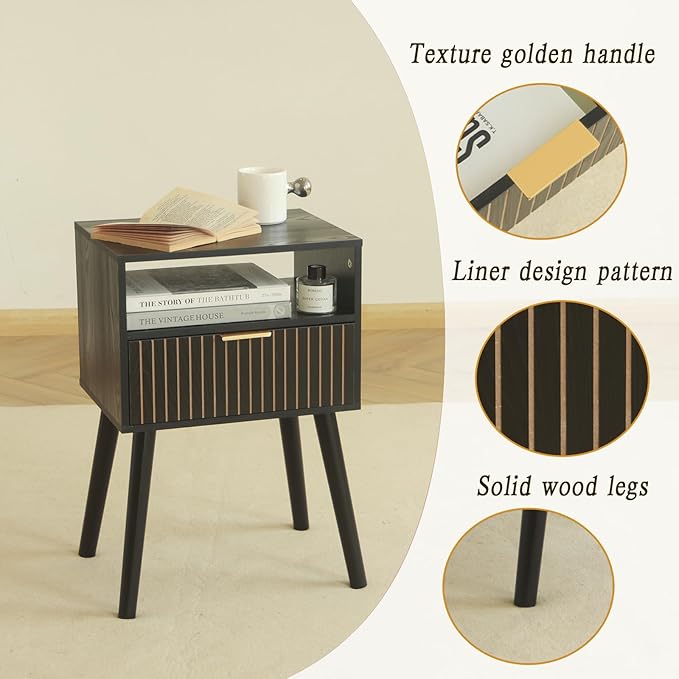 Black Nightstand with Charging Station, Mid Century Modern Bedside Table with Open Shelf and Storage Drawer, End Table with Solid Wood Legs, Black