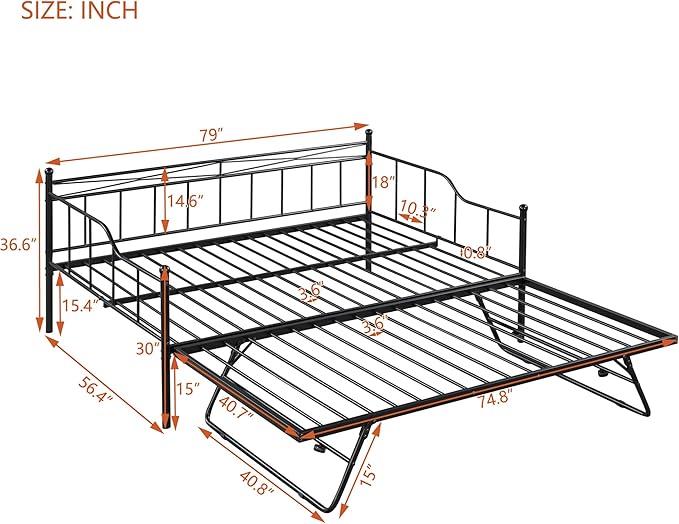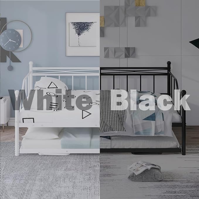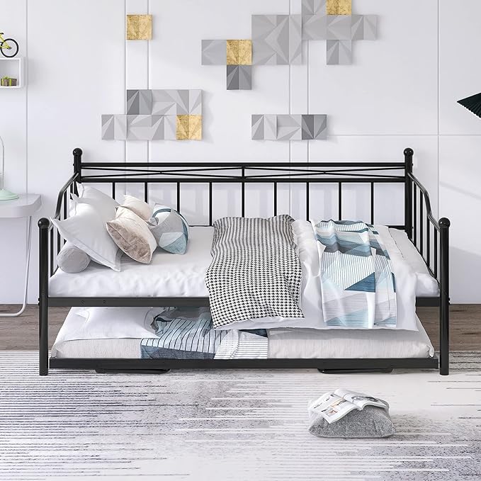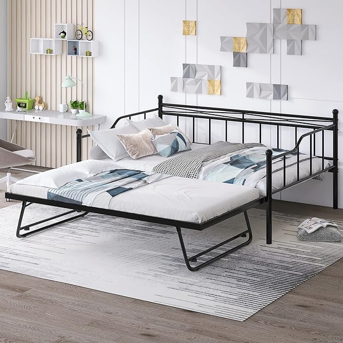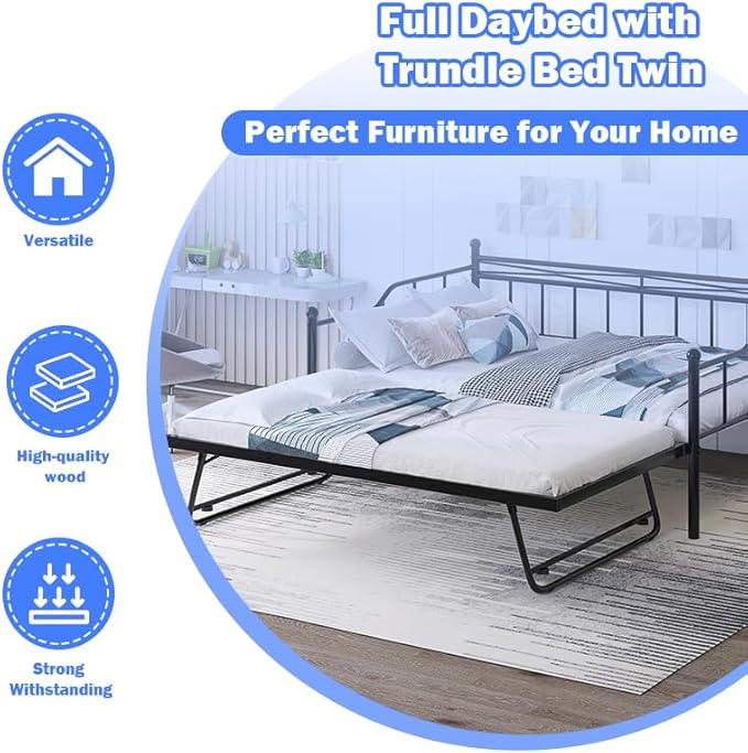 Full Daybed with Trundle Bed Twin, Metal Day Bed Frame with Pop Up Trundle, Metal Sofa Bed with Portable Folding Trundle for Bedroom, Living Room, Guest Room, Home, No Box Spring Needed, Black