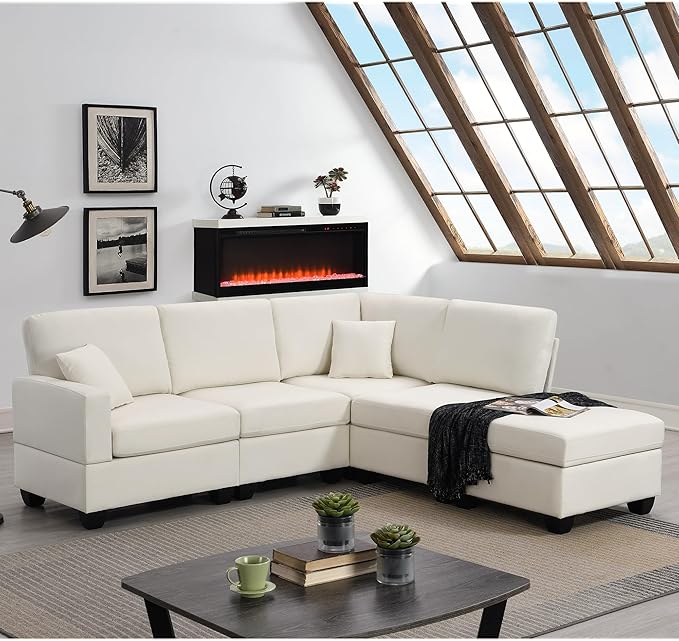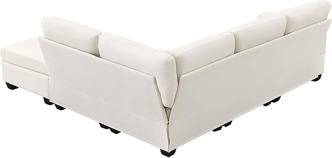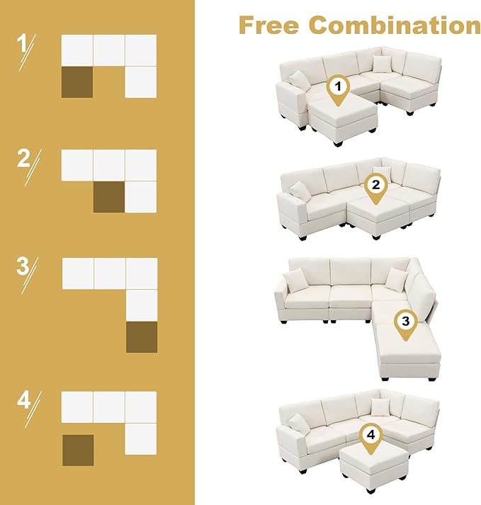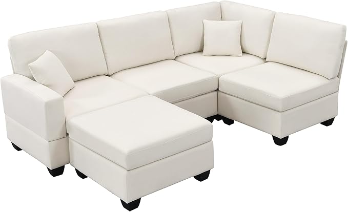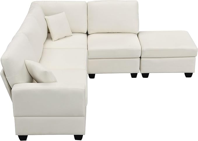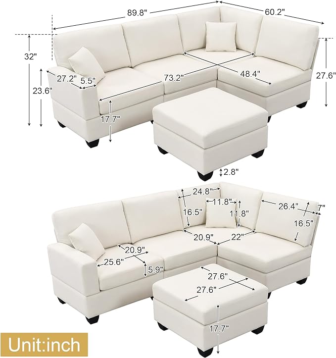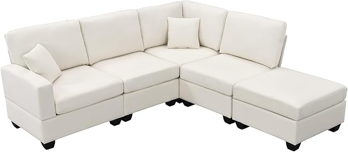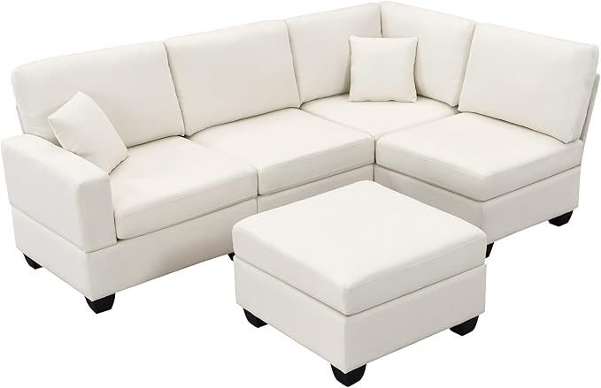 89.8" Modern Sectional Sofa with Convertible Ottoman and 2 Pillows,L-Shape Linen Fabric Corner Couch 5 Set W/Back & Cushion,can Hold up to 330 Lbs,for Apartment,Living Room,Beige