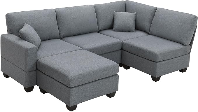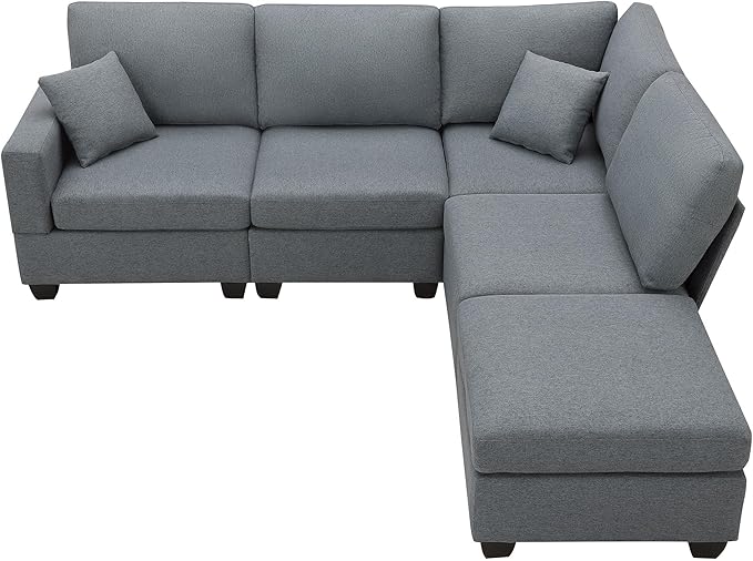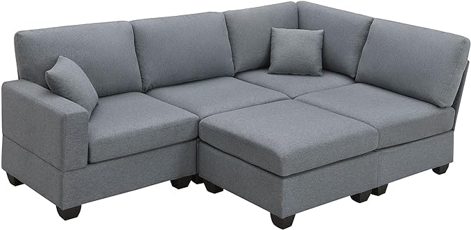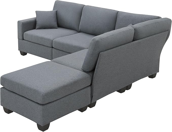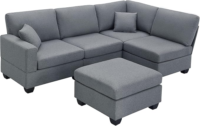 89.8" Modern Sectional Sofa with Convertible Ottoman and 2 Pillows,L-Shape Linen Fabric Corner Couch 5 Set W/Back & Cushion,can Hold up to 330 Lbs,for Apartment,Living Room,Dark Grey