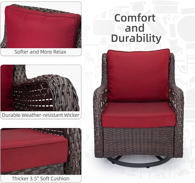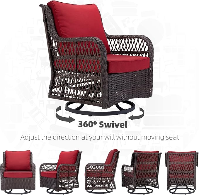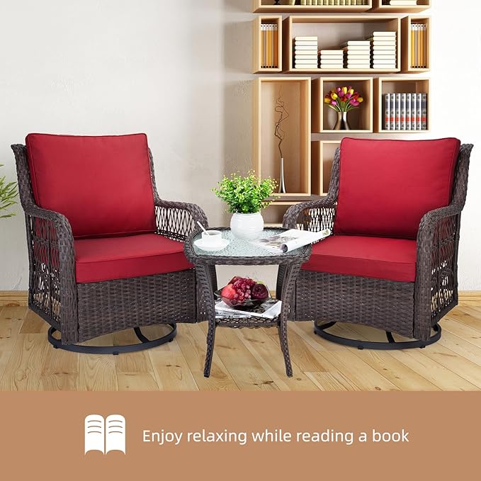IDEALHOUSE 3 Pieces Outdoor Wicker Swivel Rocker Patio Set, 360-Degree Swivel Rocking Chair Elegant Wicker Patio Bistro Set with Tempered Glass Top Side Table (Red)