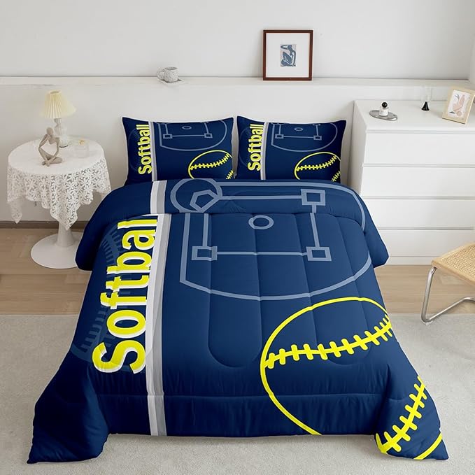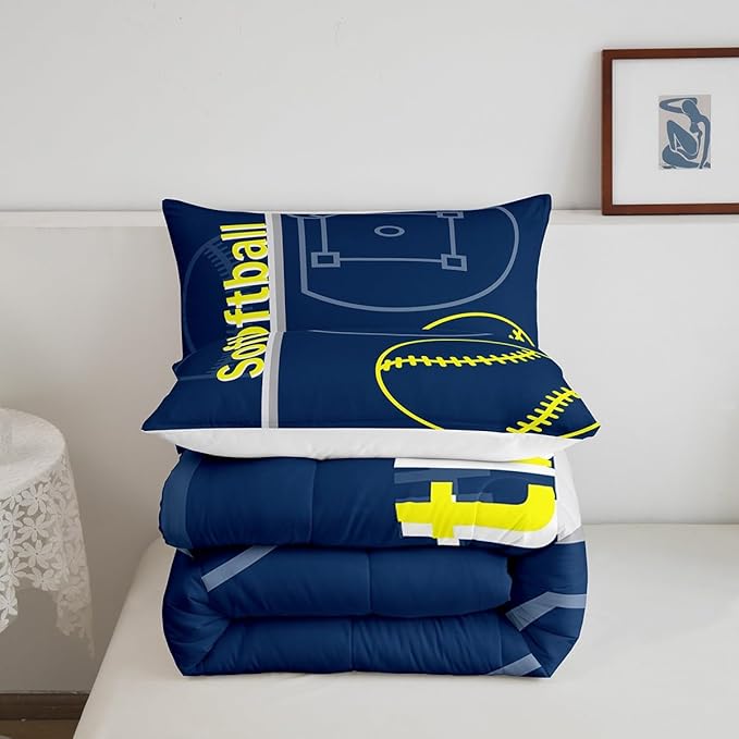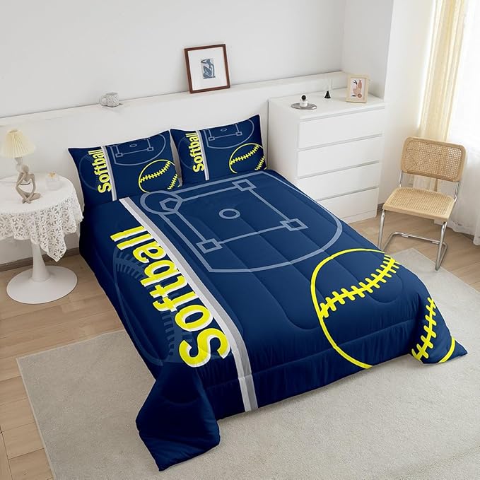 Feelyou Kids Softball Comforter Set Queen Size Sports Game Bedding Set for Boys Girls Teens Bedroom Decor Baseball Comforter Women Men Softball Gaming Duvet Set with 2 Pillow Case
